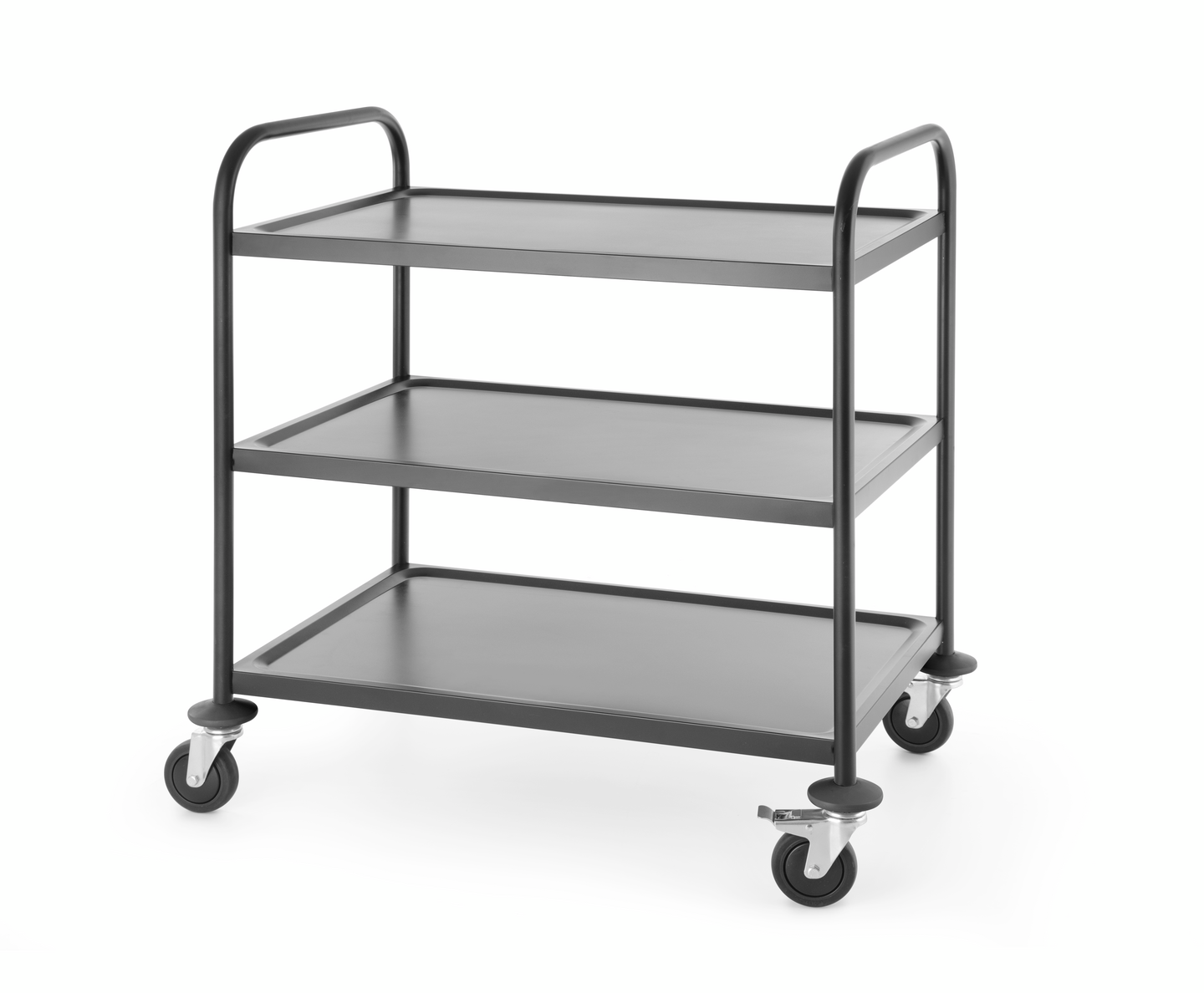 Tyylikäs mattamusta tarjoiluvaunu soveltuu erinomaisesti raskaiden kuormien siirtämiseen ravintolaympäristössä ja ammattikäytössä. Kolme hyllytasoa kestävät yhteensä jopa 150 kg (max 50 kg/hyllytaso), ja niiden alla oleva melua vaimentava materiaali lisää käyttömukavuutta. Vaunu on varustettu neljällä pyörällä, kahdet jarruilla, pyörissä kulmasuojat turvallisuuden parantamiseksi. Hyllyjen väli on 27 cm ja työtason koko 83x51 cm. Toimitetaan litteässä pakkauksessa osina, koottava. Vältä kovaa hankaavaa liikettä tason pinnoitteen suojaamiseksi.