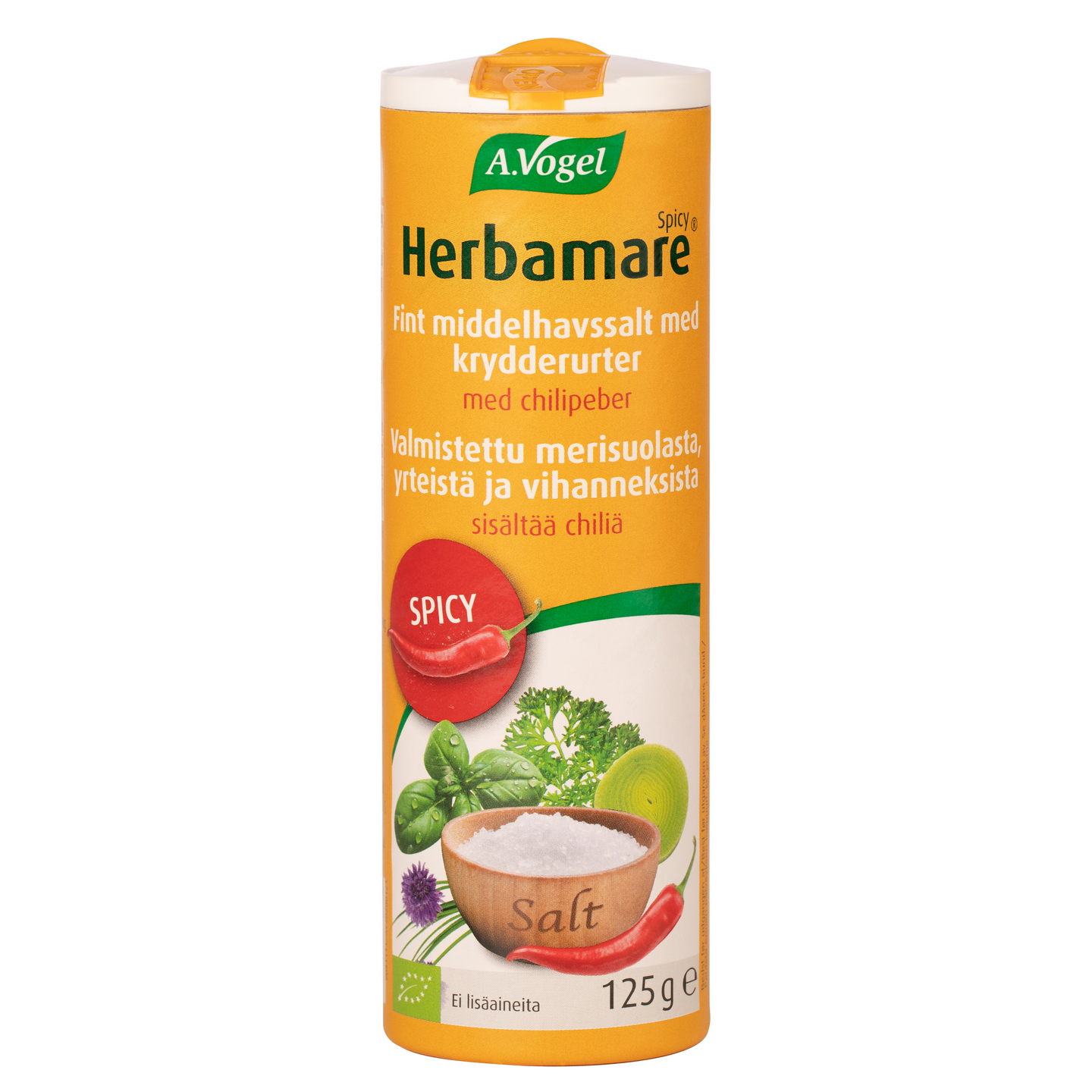 Pikantti yrttisuolaseos, kun kaipaat vahvempaa makua. Herbamare Spicy on valmistettu merisuolasta, johon on lisätty tuoreita luomuyrttejä ja -vihanneksia. Herbamare Spicy ei sisällä keinotekoisia lisäaineita eikä natriumglutamaattia, vegaaninen. Sisältää luonnonmukaista jodia merilevästä.