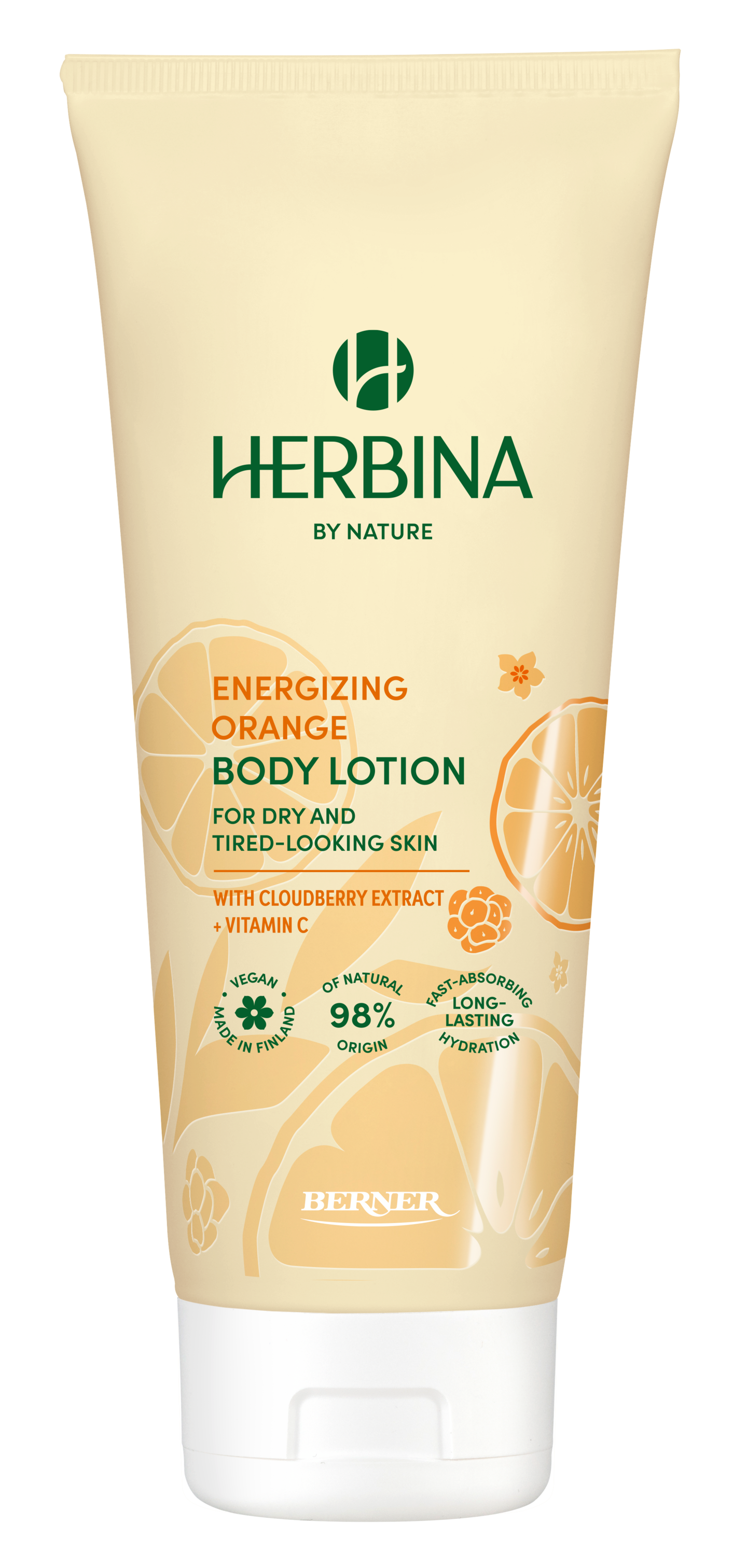 Kosteuttava Herbina Energizing Orange vartalovoide hedelmäisen pirteällä appelsiinituoksulla kosteuttaa ihoa pitkäkestoisesti, pitäen ihon pehmeänä ja kimmoisana. Appelsiinin ja lakan kasviuutteita sekä kirkastavaa C-vitamiinia sisältävä kevyt, nopeasti imeytyvä koostumus ei jätä jälkeensä rasvaista tunnetta. Vartalovoide saa ihon tuntumaan virkistyneeltä ja jättää iholle kevyen, raikkaan sitruksisen appelsiinituoksun. Täydellinen päivittäiseen käyttöön kaikille ihotyypeille, erityisesti kuiville ja samealle iholle.