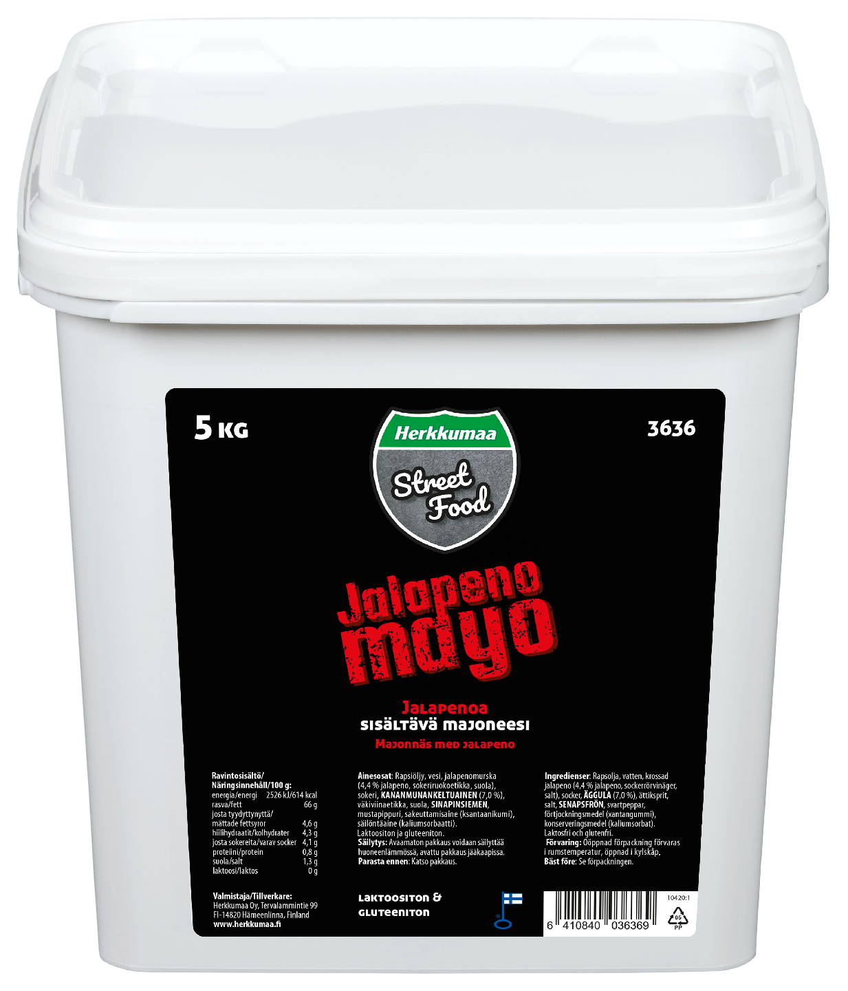 LaktoositonHerkkumaa Street Food Jalapeno Mayo on tulisempi vaihtoehto suurkeittiöiden majoneesivalikomaan. Jalapenolla tukevoitettu majoneesi kruunaa halloumin, kanan ja grillatut pihvit. Majoneesi sopii myös pöytämausteeksi, sillä se taipuu lähes joka ruuan kaveriksi. Jalapenolla maustettu majoneesi on saatavana 5 kg:n pakkauksessa.