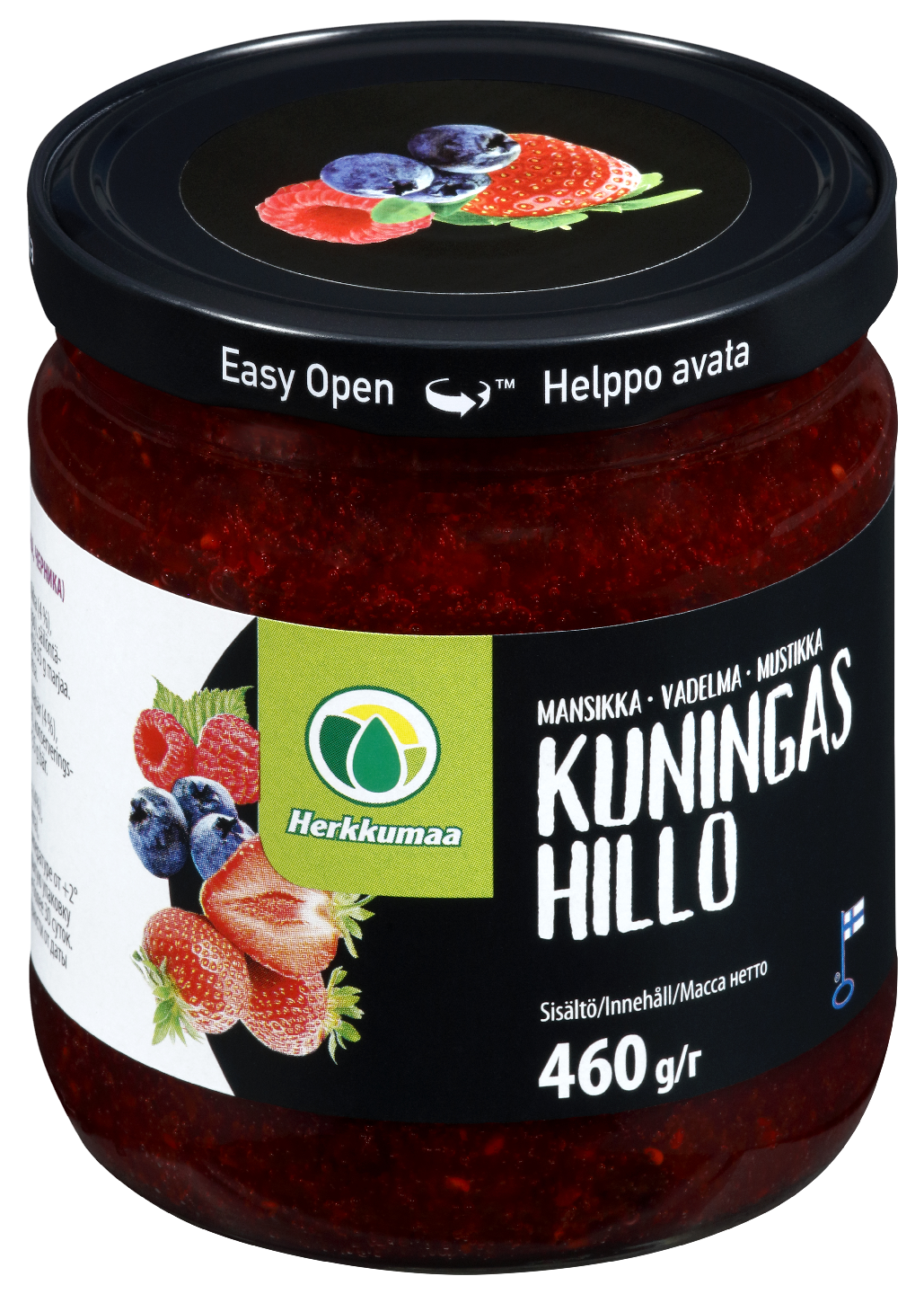 Herkkumaa kuningashillossa yhdistyvät mansikka, vadelma ja mustikka. Marjat sekoittuvat täyteläiseksi hilloksi, joka maistuu niin ohukaisten, jäätelön, jugurtin kuin viilin kanssa.