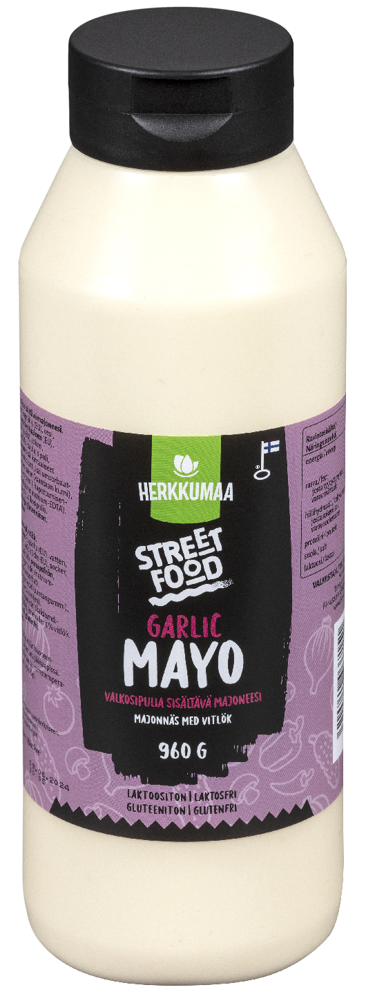 LaktoositonHerkumaan Street Food Garlic Mayo sopii niin pikaruuan lisukkeena kuin osana ruuanlaittoa tai seisovaa pöytää. Laktoositon ja gluteeniton valkosipulilla maustettu majoneesi on saatavilla 960 g:n pullossa.