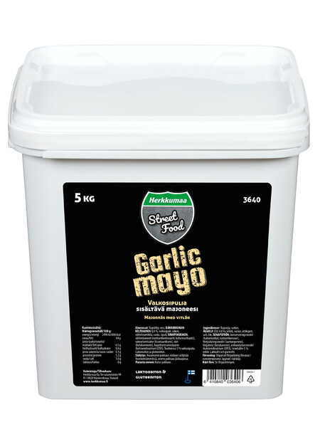 LaktoositonHerkumaan valkosipulimajoneesi sopii niin pikaruuan lisukkeena kuin osana ruuanlaittoa tai seisovaa pöytää. Laktoositon ja gluteeniton valkosipulilla maustettu majoneesi on saatavilla 5 kg:n pakkauksessa.