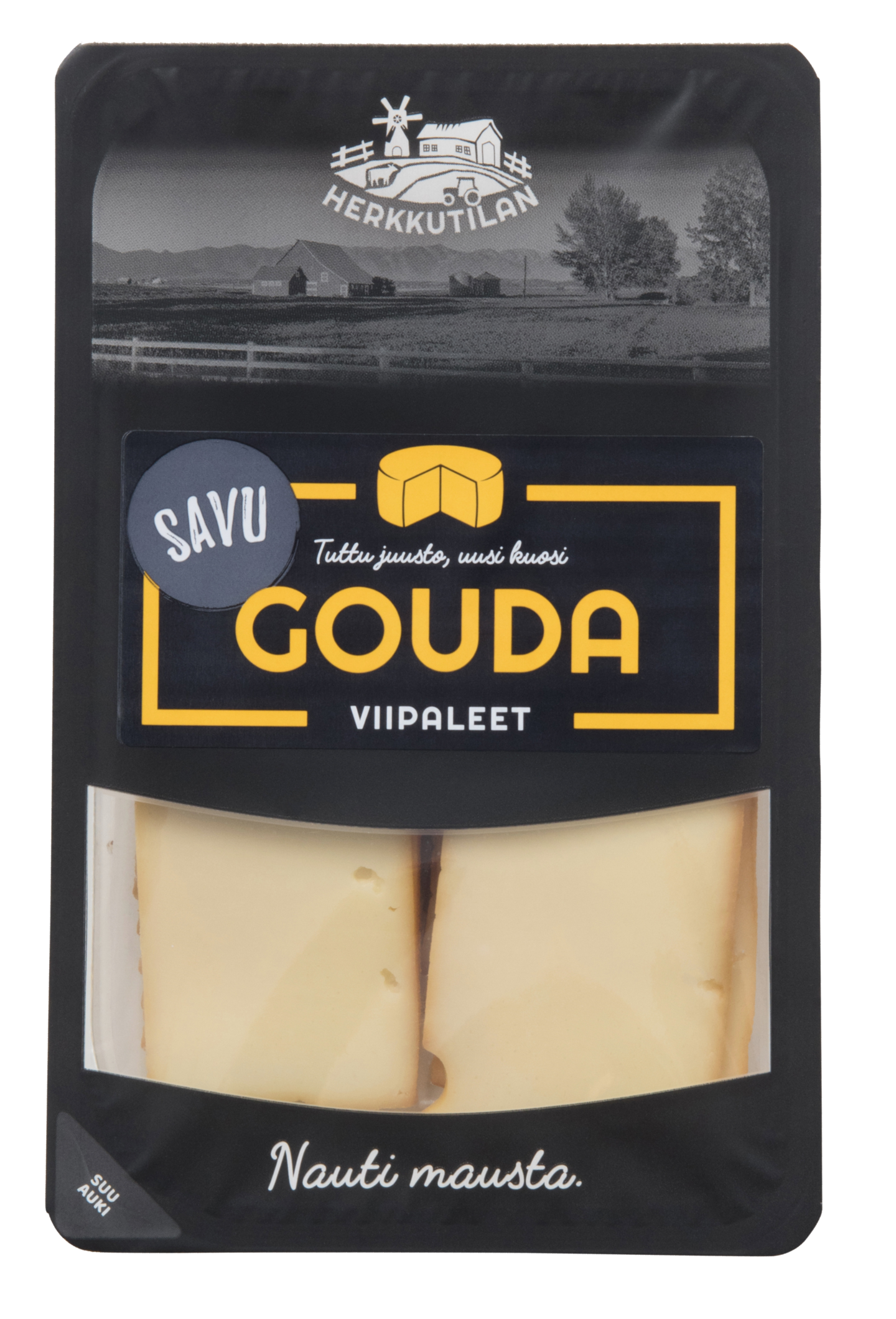 Herkkutilan Savu Gouda -viipaleissa maistuu aito savu. Niissä on pehmeä ja kermainen maku, joka tuo ylellistä makua leivän päälle ja maistuu myös sellaisenaan pikkuvälipalasiivuna. Ne sopivat erinomaisesti monenlaiseen ruoanlaittoon tuomaan lempeää savuaromia ja tuulahduksen kesää.