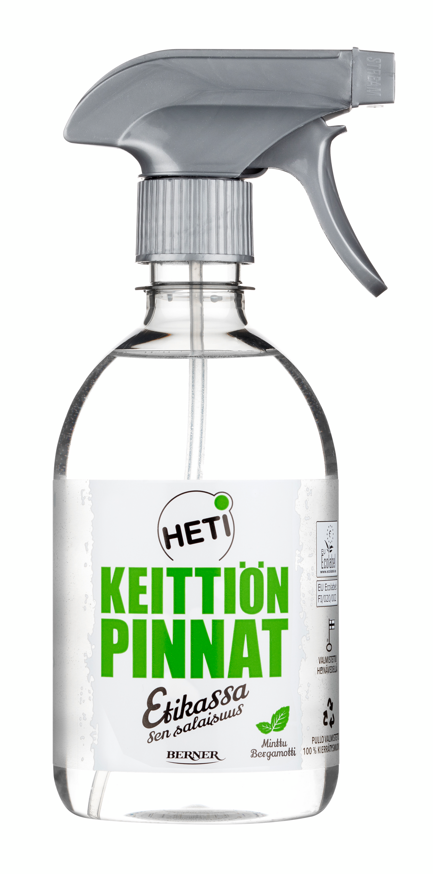 Heti keittöspray on uudistunut ja saannut EU-Kukka eco merkin! Kotimainen keittiönpintojen puhdistukseen kehitetty käyttövalmis, väkiviinaetikkapohjainen HETI-pesuaine on kiireisen arkisiivoojan pelastus. Suihkauta ja pyyhi – saat rasvan ja lian helposti pois työtasoilta, liedeltä, tiskipöydältä ja kaapinovista. HETI-puhdistusaine poistaa tehokkaasti myös sormenjäljet rosteripinnoilta.