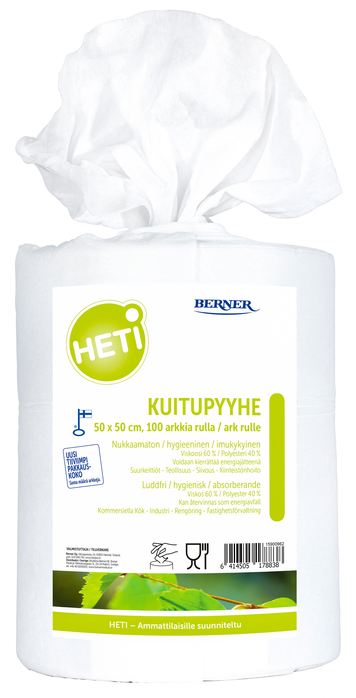 Korkealaatuinen yleispyyhintään tarkoitettu kertakäyttöpyyhe HETI Kuitupyyhe ei nukkaa, on hygieeninen ja imukykyinen. Monikäyttöistä pyyhettä on rullassa 100 kpl ja yksittäisen pyyhkeen koko on 50x50 cm.
