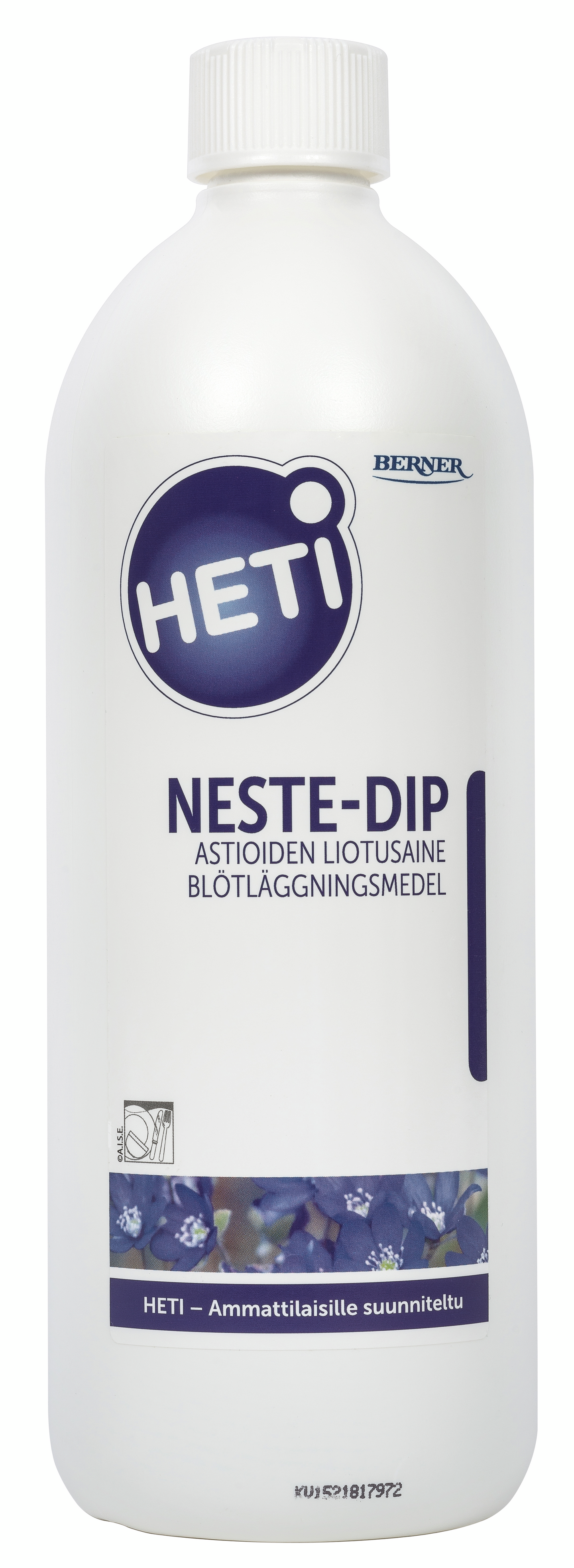 HETI Neste-Dipilla esiliotetaan astioita ja ruokailuvälineitä. Tuote soveltuu myös astioiden kirkastamiseen. HETI Neste-Dip ei sisällä klooria.