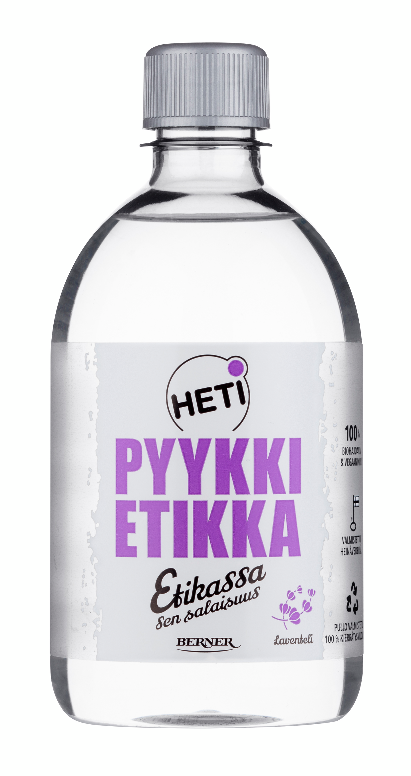Kotimaista Rajamäen väkiviinaetikkaa sisältävä HETI-pyykkietikka korvaa huuhteluaineen. Käyttövalmiit pyykkietikat sopivat kaikille materiaaleille, myös silkille, villalle ja urheiluvaatteille kuten Goretex. Ne poistavat vaatteista vaikeitakin tunkkaisia hajuja, kirkastavat värejä ja suojaavat vaatekuituja. Tämän lisäksi etikka pitää pyykinpesukoneen puhtaana. Ihanan lopputuloksen viimeistelee rauhoittava laventelin tuoksu.