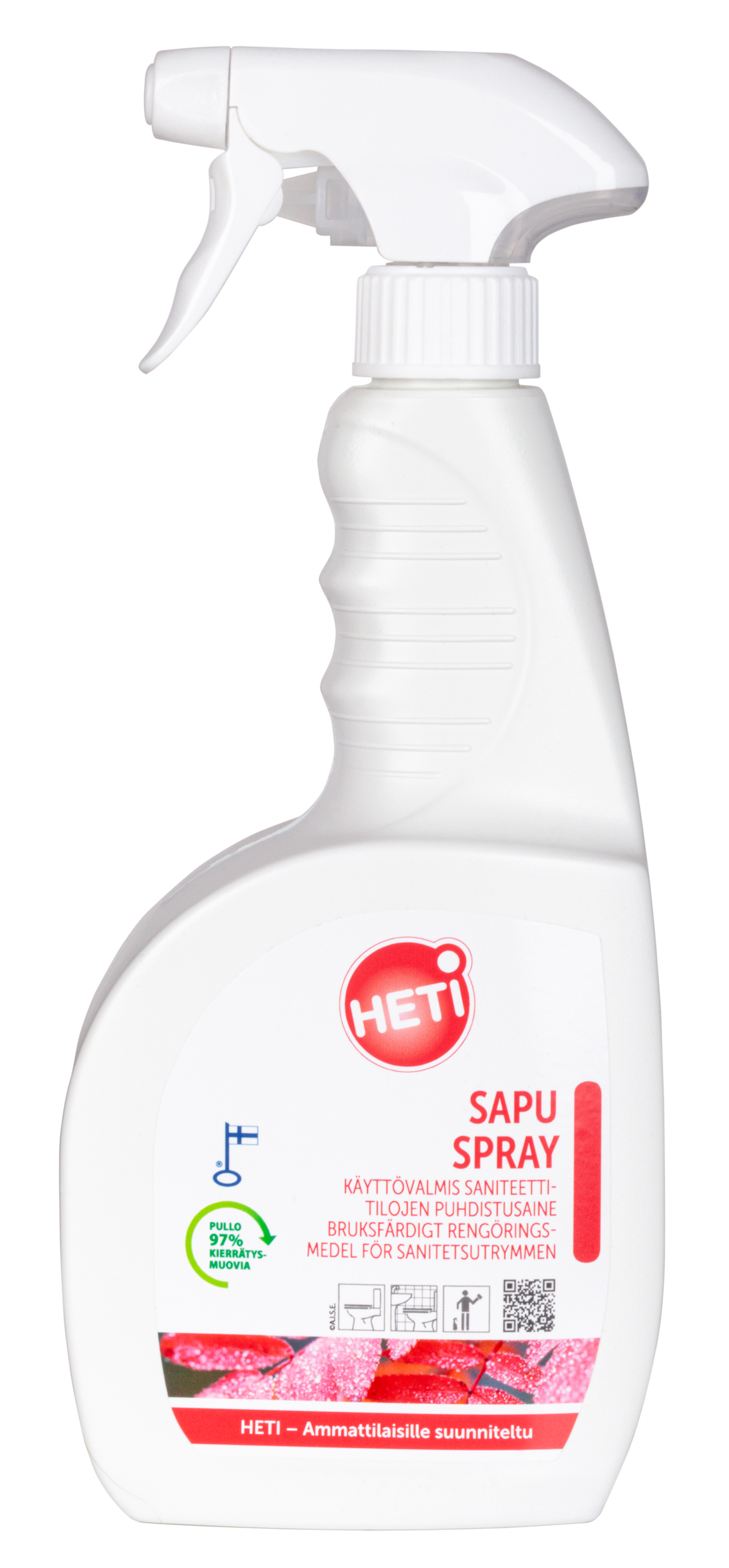 Valmis käyttöliuos HETI Sapu Spray saniteettitilojen helppoon ja nopeaan puhdistamiseen. Tuote soveltuu käytettäväksi kaikille pinnoille, kuten pesualtaalle, wc-istuimelle, lattialle ja pystypinnoille. HETI Sapu Spray poistaa tehokkaasti likaa jättäen miellyttävän tuoksun, eikä vaadi erillistä huuhtelua.