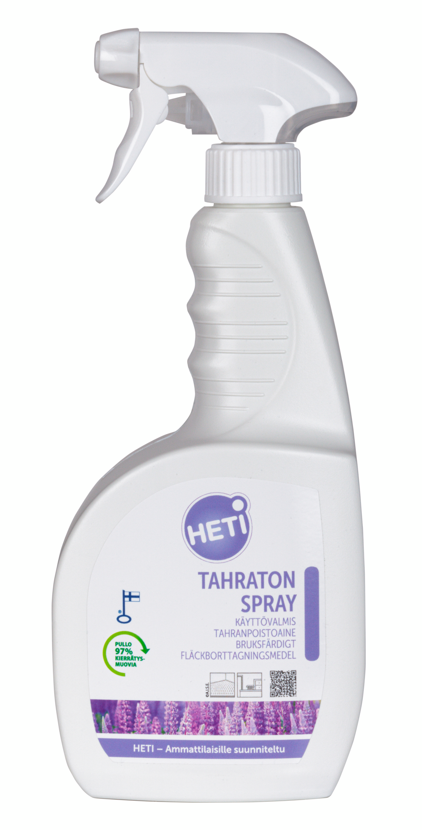 Käyttövalmis tahranpoistoaine HETI Tahraton Spray soveltuu tekstiilipinnoille ja koville pinnoille. Tuotteella saa puhdistettua tehokkaasti hankalaakin likaa ja se neutraloi hajuja tekstiilipinnoilta. HETI Tahratonta voidaan käyttää myös likaisen pyykin esikäsittelyssä.
