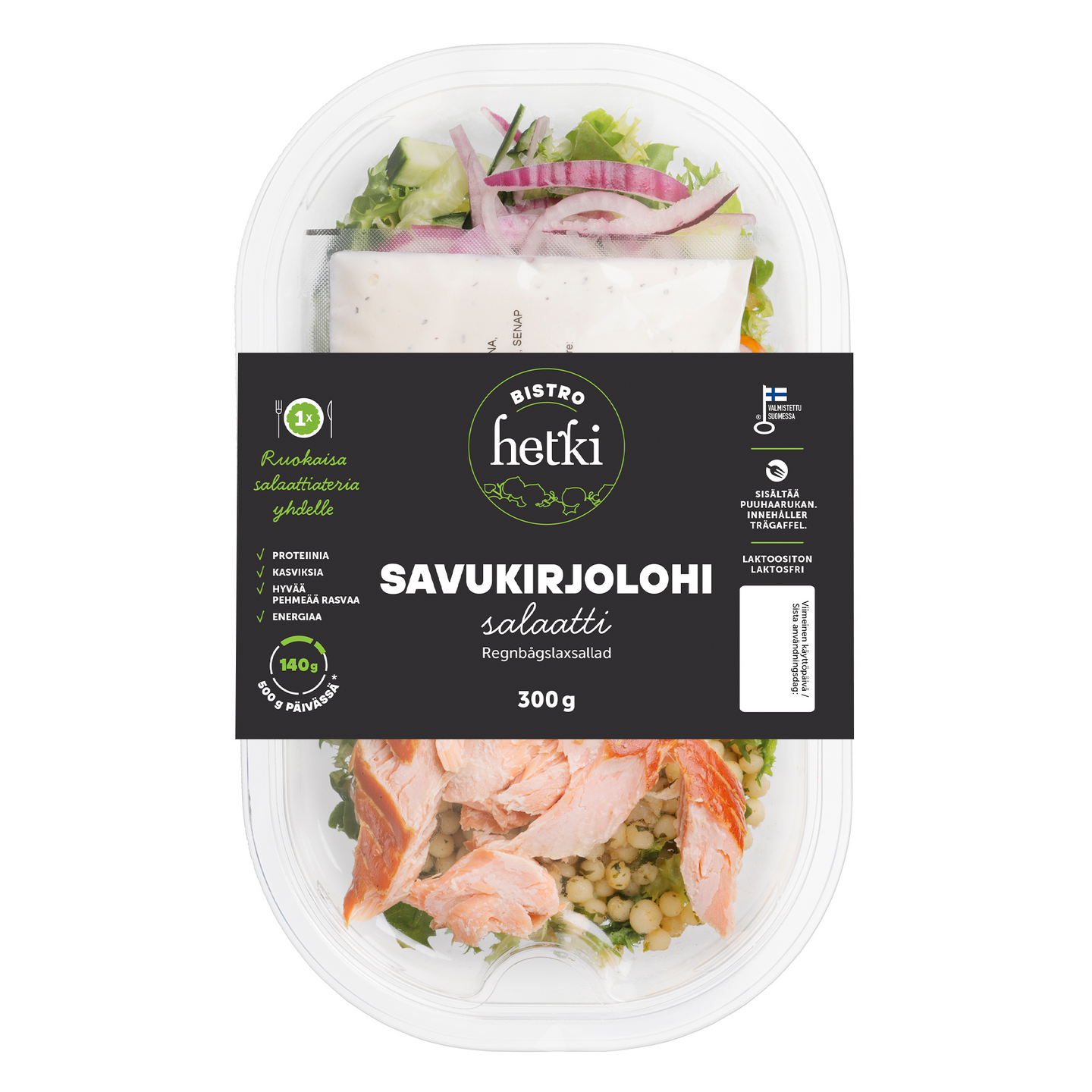 Hetki Bistro savukirjolohisalaatti on erinomainen valinta, kun etsit kiireisen arjen hetkiin täysipainoista ateriaa. Se sopii mainiosti niin lounaaksi kuin päivälliseksikin.