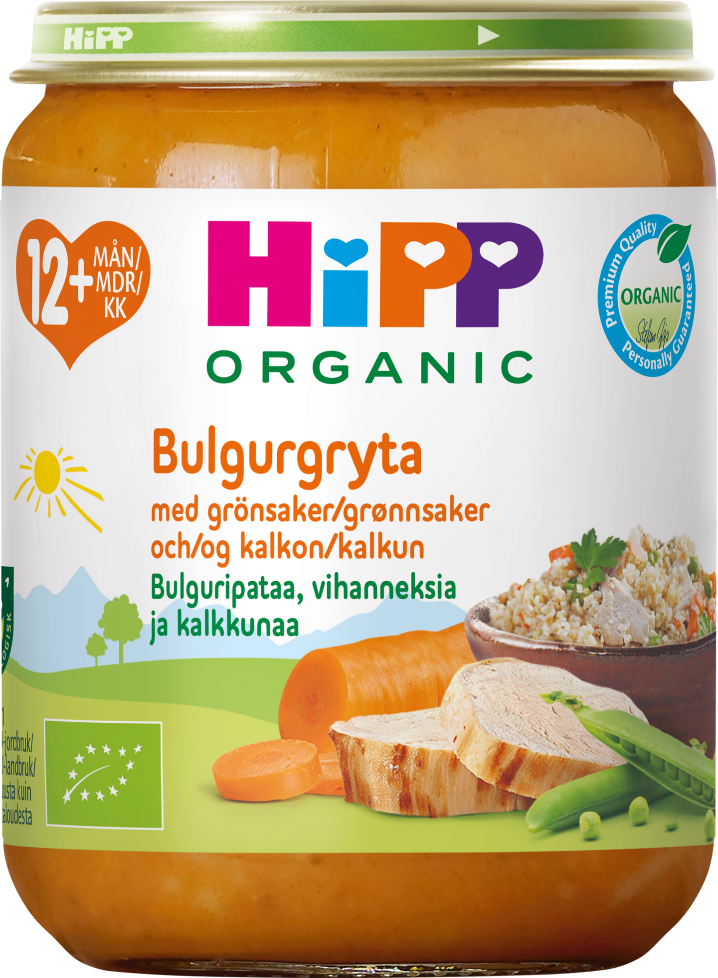 HiPPin bulgurinpata vihanneksilla ja kalkkunalla on luomuruoka 12 kuukauden ikäisille ja sitä vanhemmille lapsille. HiPPin ateriat valmistetaan huolella parhaista luomuraaka-aineista. Siksi ne maistuvat niin paljon – ja niin herkullisilta! Tarjoamme vaihtelua eri ikäryhmille suunnitelluilla jännittävillä aterioilla. Kaikki reseptimme on kehitetty yhdessä ravitsemusasiantuntijoiden kanssa, jotta voit olla varma, että lapsesi saa kaikki tarvitsemansa ravintoaineet.