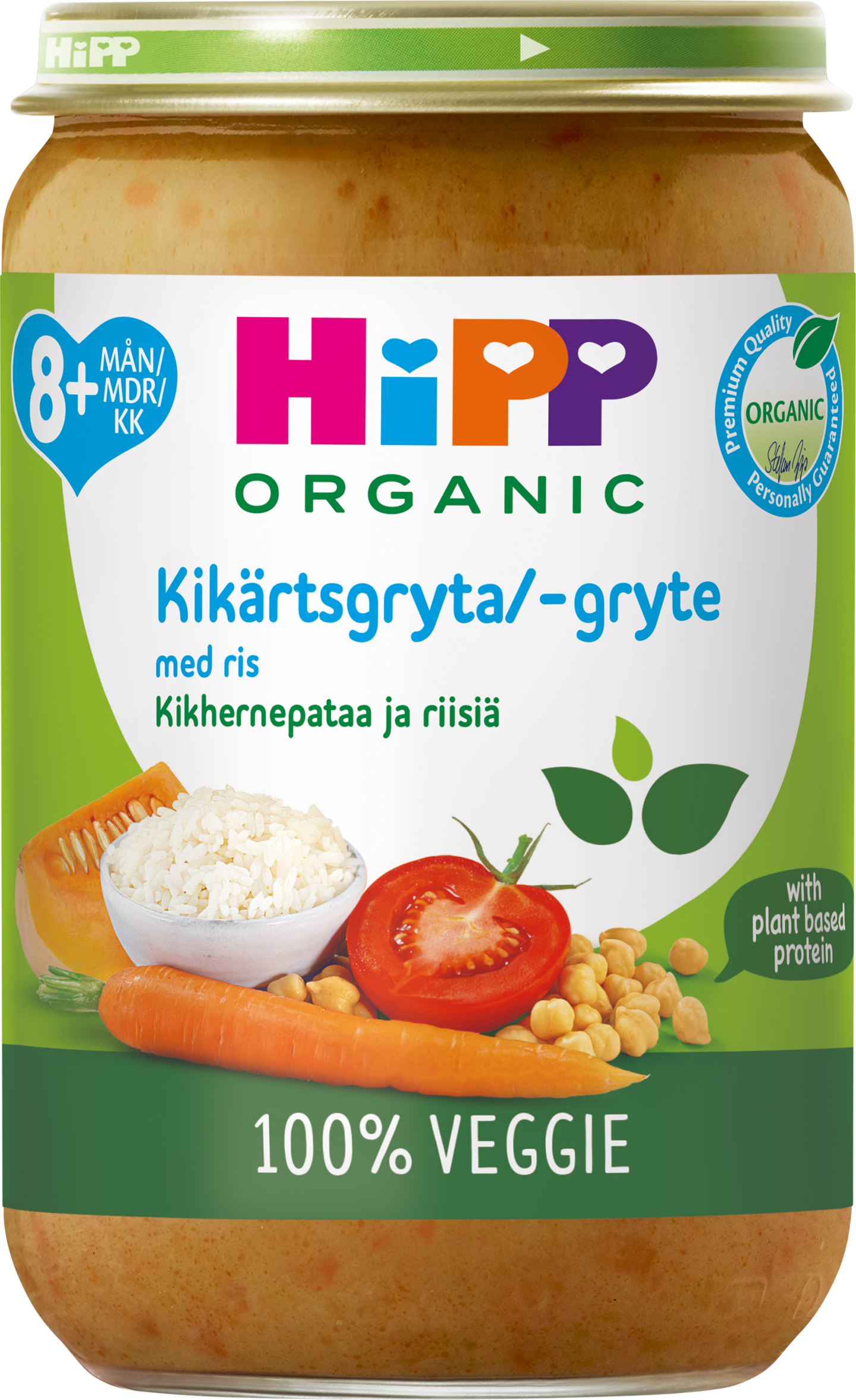 VegaaninenHiPPin kikhernepata riisillä on luomu- ja vegaaninen ateria 8 kuukauden ikäisille ja sitä vanhemmille lapsille. Se sisältää vain kasvipohjaista proteiinia kikherneistä ja herneistä, mikä edistää ravitsevaa ja tasapainoista ateriaa.