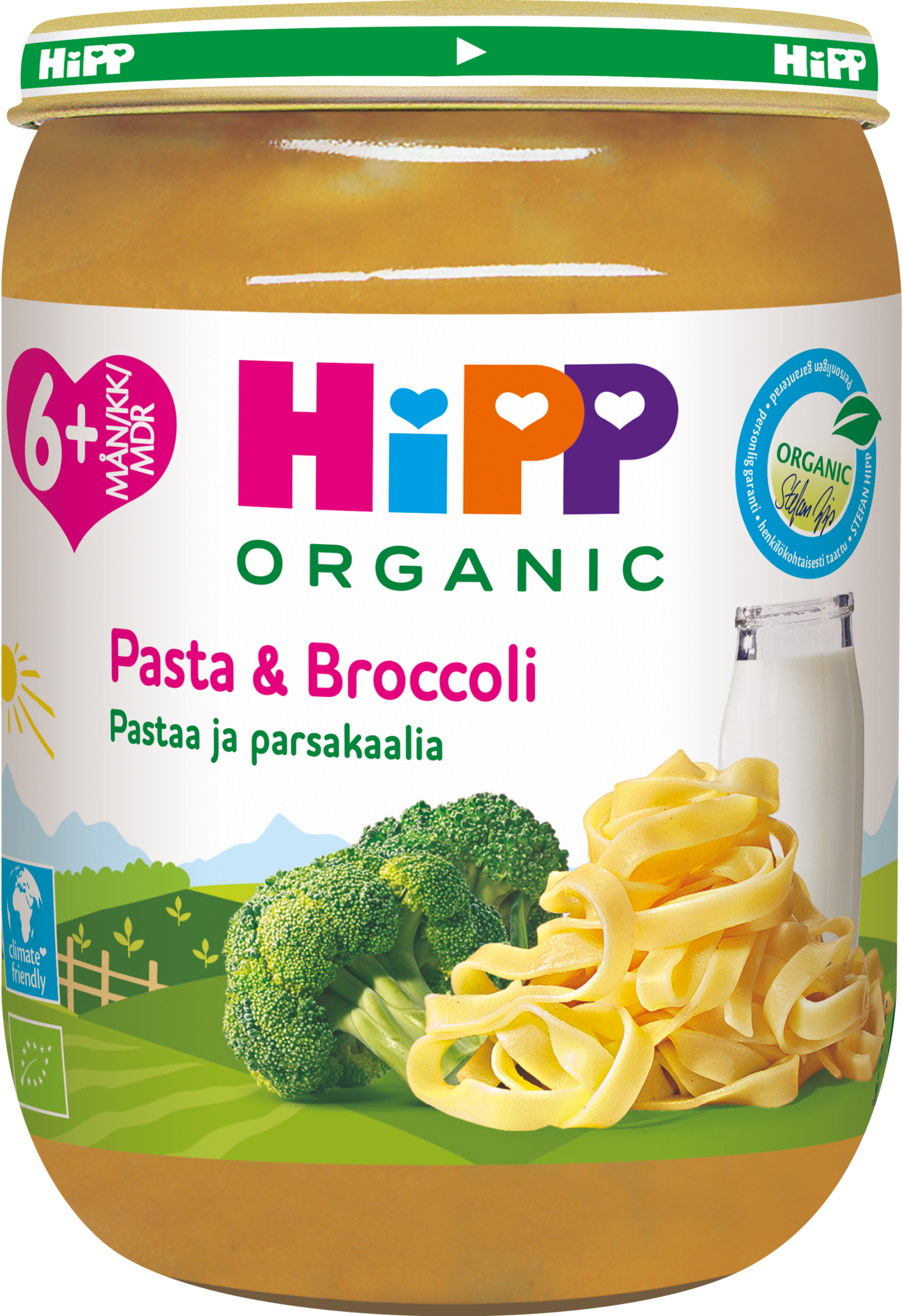 HiPPin ilmastopositiiviset ateriat on valmistettu huolella parhaista luonnonmukaisista raaka-aineista. Siksi ne ovat mieluisia ja maistuvat hyviltä. Kaikki reseptimme on laadittu ravitsemusasiantuntijoiden kanssa, jotta voit olla varma, että lapsesi saa ruoasta kaikki tarvitsemansa hyödyt. HiPP Luomu Pastaa ja Parsakaalia. Vain parhaista luomuraaka-aineista huolella valmistettu lämminruoka. Alkaen 6 kuukauden ikäisille. Sopii lounaaksi tai illalliseksi.