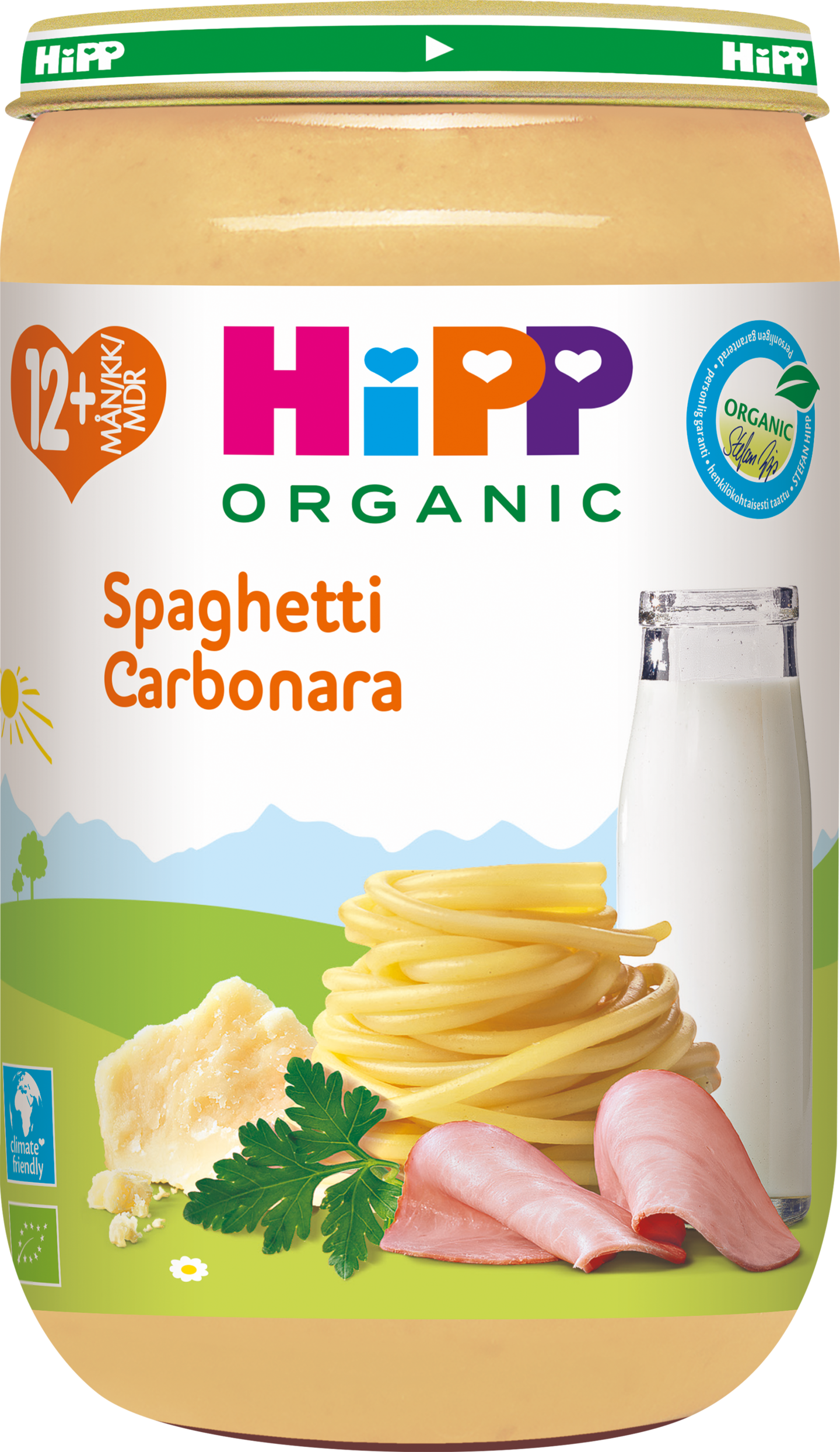 HiPPin ilmastopositiiviset ateriat on valmistettu huolella parhaista luonnonmukaisista raaka-aineista. Siksi ne ovat mieluisia ja maistuvat hyviltä. Kaikki reseptimme on laadittu ravitsemusasiantuntijoiden kanssa, jotta voit olla varma, että lapsesi saa ruoasta kaikki tarvitsemansa hyödyt. HiPP Luomu Spaghetti Carbonara. Vain parhaista luomuraaka-aineista huolella valmistettu lämminruoka. Alkaen 12 kuukauden ikäisille. Sopii lounaaksi tai illalliseksi.