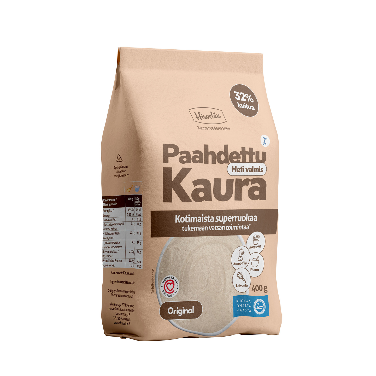 VegaaninenHirvelän Paahdettu Kaura on suomalaista superruokaa. Sitä voi lisätä smoothieen tai sekoittaa lusikalla esimerkiksi jogurttiin tai rahkaan. Se käy hyvin leivontaan. Hellästi kypsennetty kauramme on heti syötäväksi valmis vatsan toimintaa edistävä terveystuote*. Tuote on gluteeniton ja sillä on "Hyvää Suomesta" -merkki. Hirvelän Kauratuotteet Oy on valmistanut kauratuotteita vuodesta 1966.