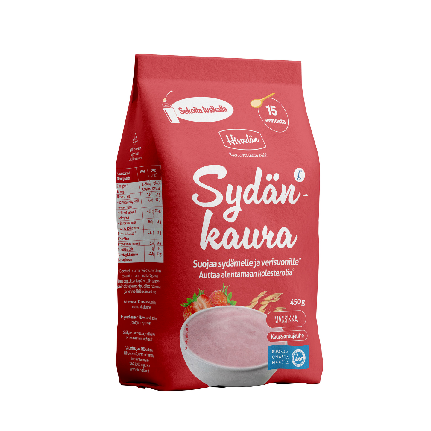VegaaninenHirvelän Sydänkaura on Suomessa kehitetty ja valmistettu terveysvaikuttainen kauratuote, jonka yksittäinen annos (30 g) sisältää yli 3 grammaa beetaglukaania, jonka säännöllisen saannin on osoitettu alentavan veren kolestrolia. Korkea kolesteroli on sydän- ja verisuonitautien kehittymisen riskitekijä*. Tuotteen miellyttävä maku on peräisin kaurasta, sokerista sekä laadukkaasta pakastekuivatusta mansikkajauheesta. Tuote on gluteeniton ja sillä on "Hyvää Suomesta" -merkki. Hirvelän Kauratuotteet Oy on valmistanut kauratuotteita vuodesta 1966.