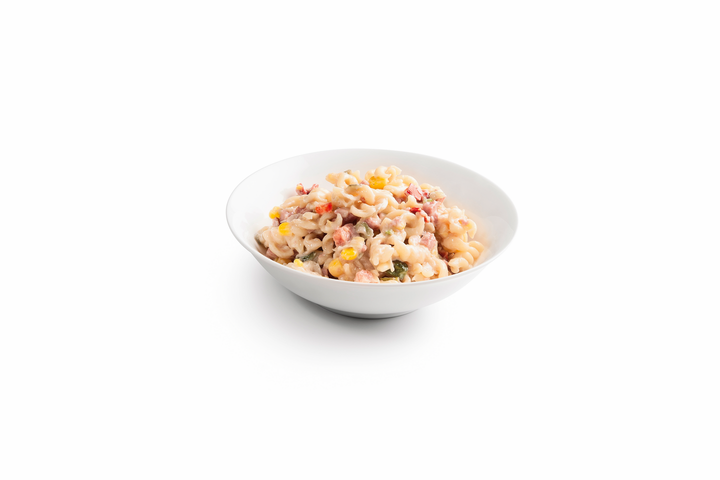 Keitetty pasta (durumVEHNÄjauho), kastike (rypsiöljy, punaviinietikka, SINAPPI (vesi, SINAPINsiemen, sokeri, etikka, rypsiöljy, suola, väri (sokerikulööri), mauste (chilipippuri)), sokeri, vesi, suola, maltodekstriini, stabilointiaineet (E401, guarkumi, ksantaanikumi, E450, E509), happamuudensäätöaineet (sitruunahappo, E331), mausteet (mustapippuri, rakuuna), glukoosisiirappi, säilöntäaineet (kaliumsorbaatti, E250, E211)), balkanmakkara 15 % (suomalainen broilerin-, sian- ja naudanliha, vesi, koneellisesti erotettu broilerinliha, kamara, perunajauho, jodioitu suola, stabilointiaineet (muunnettu tärkkelys, E450), dekstroosi, hapettumisenestoaine (askorbiinihappo), aromit), maissi, purjo, säilykekurkku (kurkku, vesi, etikka, suola, sokeri, aromit, makeutusaine (E954)), paprika, suola.
