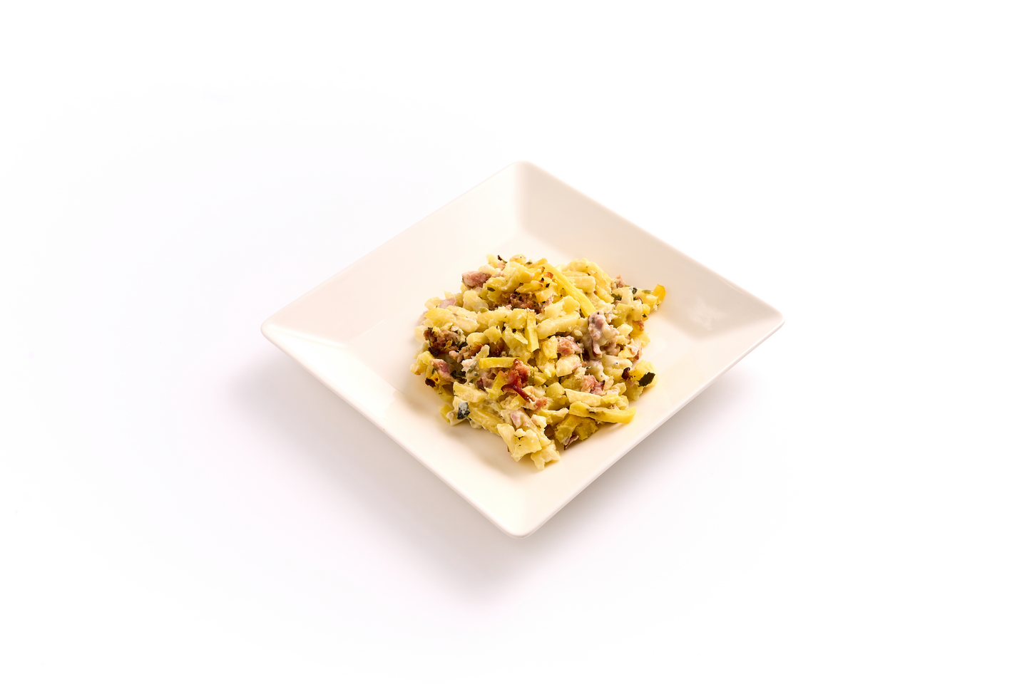 Peruna (Suomi), laktoositon kasvirasvasekoite [rasvaton MAITO, vesi kasviöljyt (rapsi, rypsi) muunnetut tärkkelykset (maissi, tapioka), emulgointiaine (E472e), aromi, väri (E160a)], kinkkuvalmiste 12 % [sianliha (Suomi), vesi, jodioitu suola, stabilointiaineet (E450, E451), maissidekstroosi, hapettumisenestoaine (E301), säilöntäaine (E250), savuaromi], sipuli, maltodekstriini, jodioitu suola, JUUSTOjauhe, mausteet (valkosipuli, mustapippuri), aromi (liha).