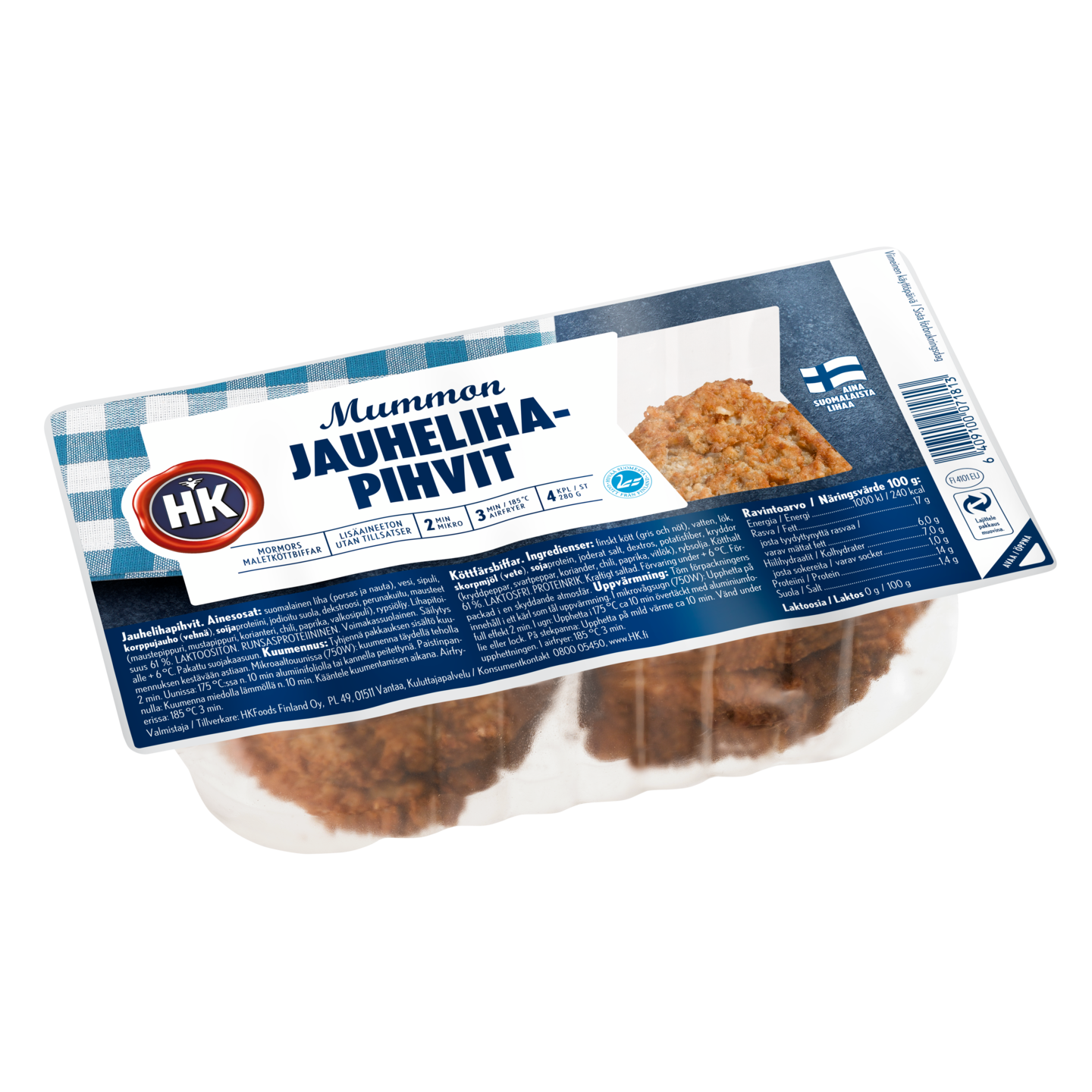 LaktoositonSuomalaisesta lihasta paistetut, lisäaineettomat HK Mummon Jauhelihapihvit maistuvat taatusti kaikille vauvasta vaariin. Valmiiksi kypsennetyt pihvit kuumenevat parissa minuuttissa mikrossa, airfryerissa, pannulla tai uunissa. Tarjoile pihvit esimerkiksi perinteisesti perunamuusin kera tai vaikka hampurilaisen välissä. Pakkaus sisältää 4 maistuvaa pihviä. Runsaasti proteiinia sisältävät Mummon Jauhelihapihvit on valmistettu Suomessa. Lajittele pakkaus ruokailun jälkeen muovina.