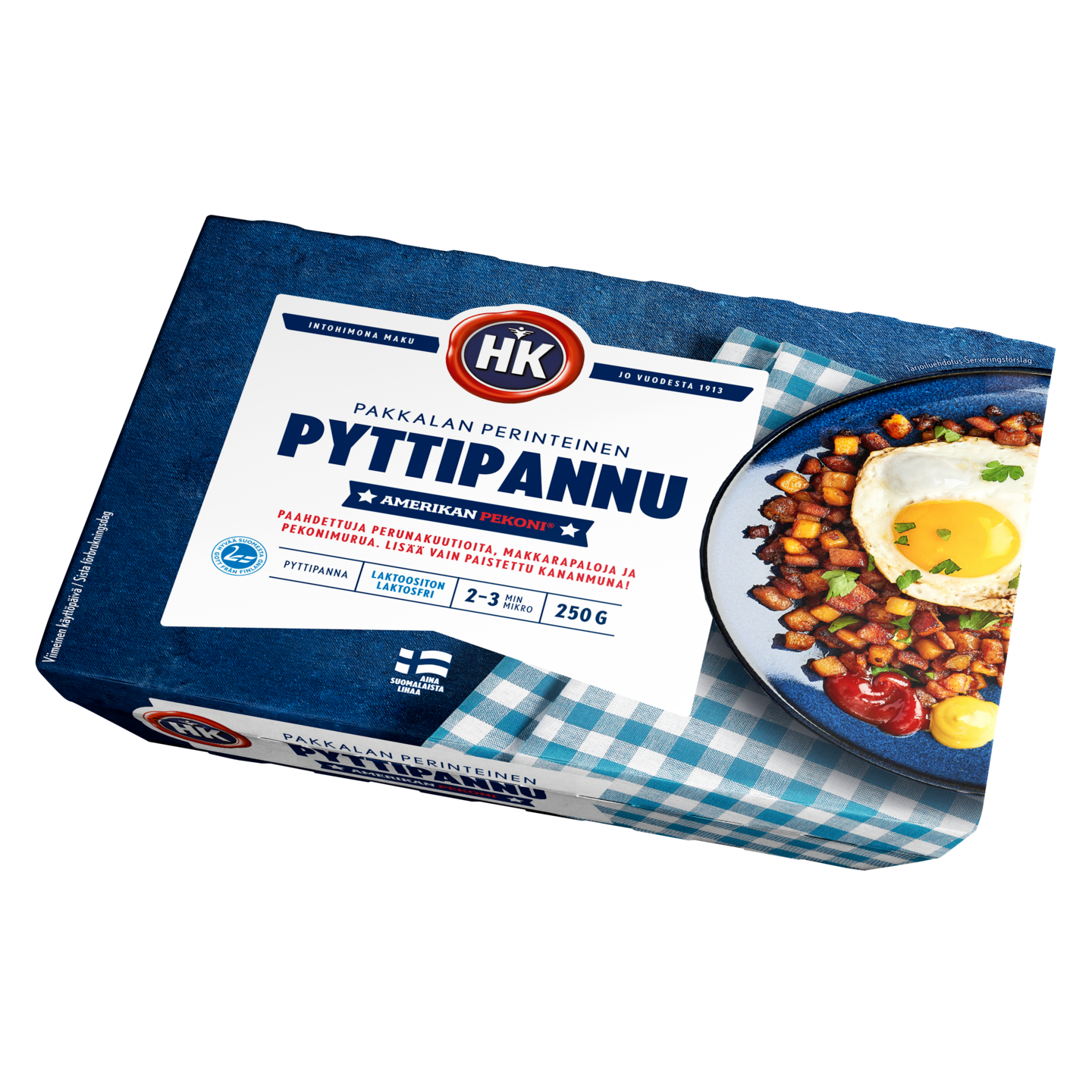 LaktoositonHK Pakkalan perinteinen -mikroateriamme tarjoavat tuttua kotiruokaa ja maukkaita makuja päivän ruokahetkiin. Pyttipannu-annoksessa tarjoilemme suomalaisesta lihasta valmistettua makkaraa, perunakuutioita sekä aitoa HK Amerikan Pekoni(R) -pekonia maukkaaksi paahdettuna. Lisää halutessasi paistettu kananmuna. Mikrovalmis annosateria lämpenee mikrossa parissa minuutissa ja annoksen voi nauttia pakkauksestaan. Täydennä annosta mieleisillä kasviksilla. Pakkalan perinteisissä valmisruoissa käytämme vain suomalaista lihaa ja valmistamme ateriat Suomessa, Vantaan Pakkalassa. Lajittele pakkaus aterian jälkeen muovina ja kartonkina.
