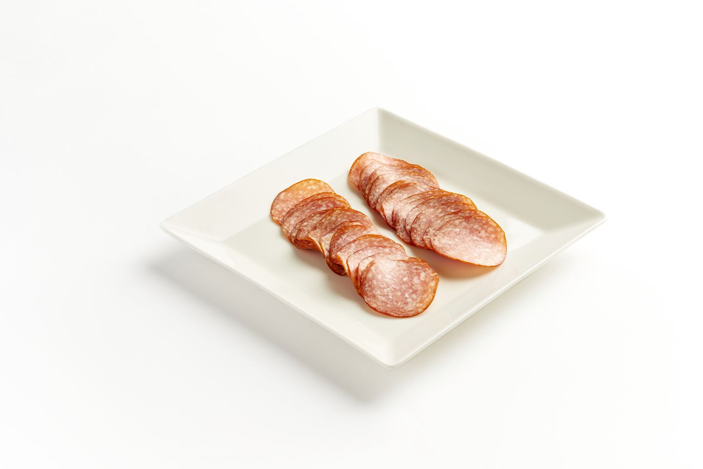 LaktoositonTäyteläinen suomalaisesta porsaanlihasta valmistettu valkosipulilla maustettu salami.