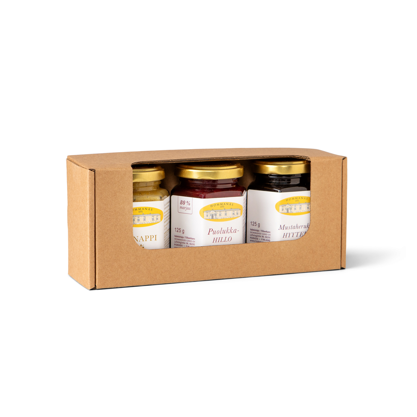 Sinappi 110 g: rypsiöljy, SINAPPIJAUHE, sokeri, LAKTOOSITON KERMA, etikka, OLUT, suola, pippuri. Puolukkahillo 125 g: puolukka (Suomi), sokeri, sakeuttamisaine (pektiini). 100 g hilloa sisältää 80 g marjaa. Mustaherukkahyytelö 125 g: mustaherukkatäysmehu (EU), sokeri, sakeuttamisaine (pektiini). 100 g hyytelöä sisältää 79 g mustaherukkatäysmehua.
