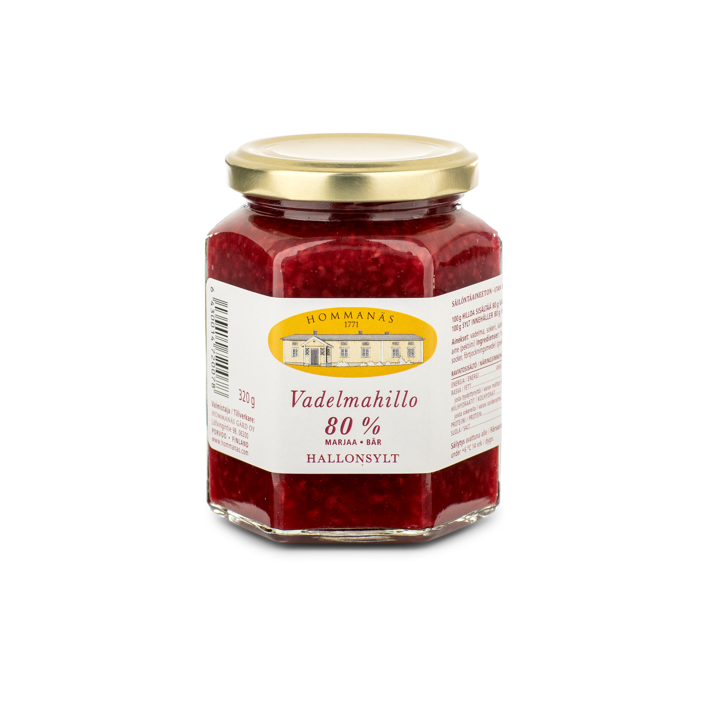 vadelma, sokeri, sakeuttamisaine (pektiini). 100 g hilloa sisältää 80 g vadelmaa.
