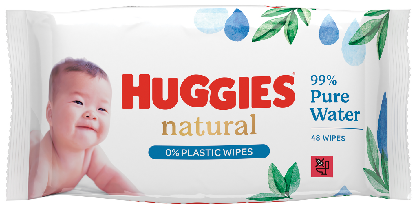 HUGGIES® NATURAL 0 % PLASTIC BABY WIPES ovat ihoa helliviä kosteuspyyhkeitä, jotka on valmistettu 100% luonnollisista kuiduista. Infusoitu 99 % puhdistulla vedellä, jonka lisäksi ne ovat