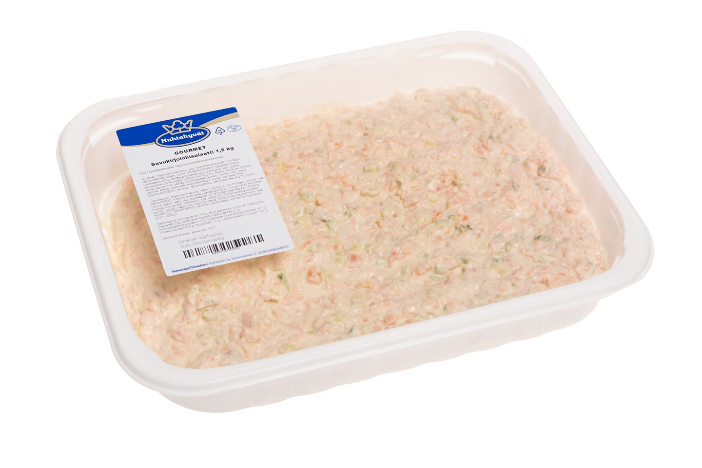 majoneesi [vesi, rapsiöljy, kananmunankeltuainen vapaa,väkiviinaetikka, muunnettu maissitärkkelys, sokeri, jodioitu suola, sinapinsiemen, säilöntäaine (E202), sakeuttamisaine (E415)], savulohi 26 % [viljelty lohi (Norja), viljelty kirjolohi (Suomi, Ruotsi, Norja tai Tanska) (vaihtelevina osuuksina), suola, savuaromi], porkkanakuutio, säilötty kurkkusalaatti [kurkku, sokeri, vesi, sipuli, paprika, etikka, muunneltu maissitärkkelys, suola, mausteet (mm. sinapinsiemen), aromit], sipuli, väkiviinaetikka, säilöntäaine (E202).