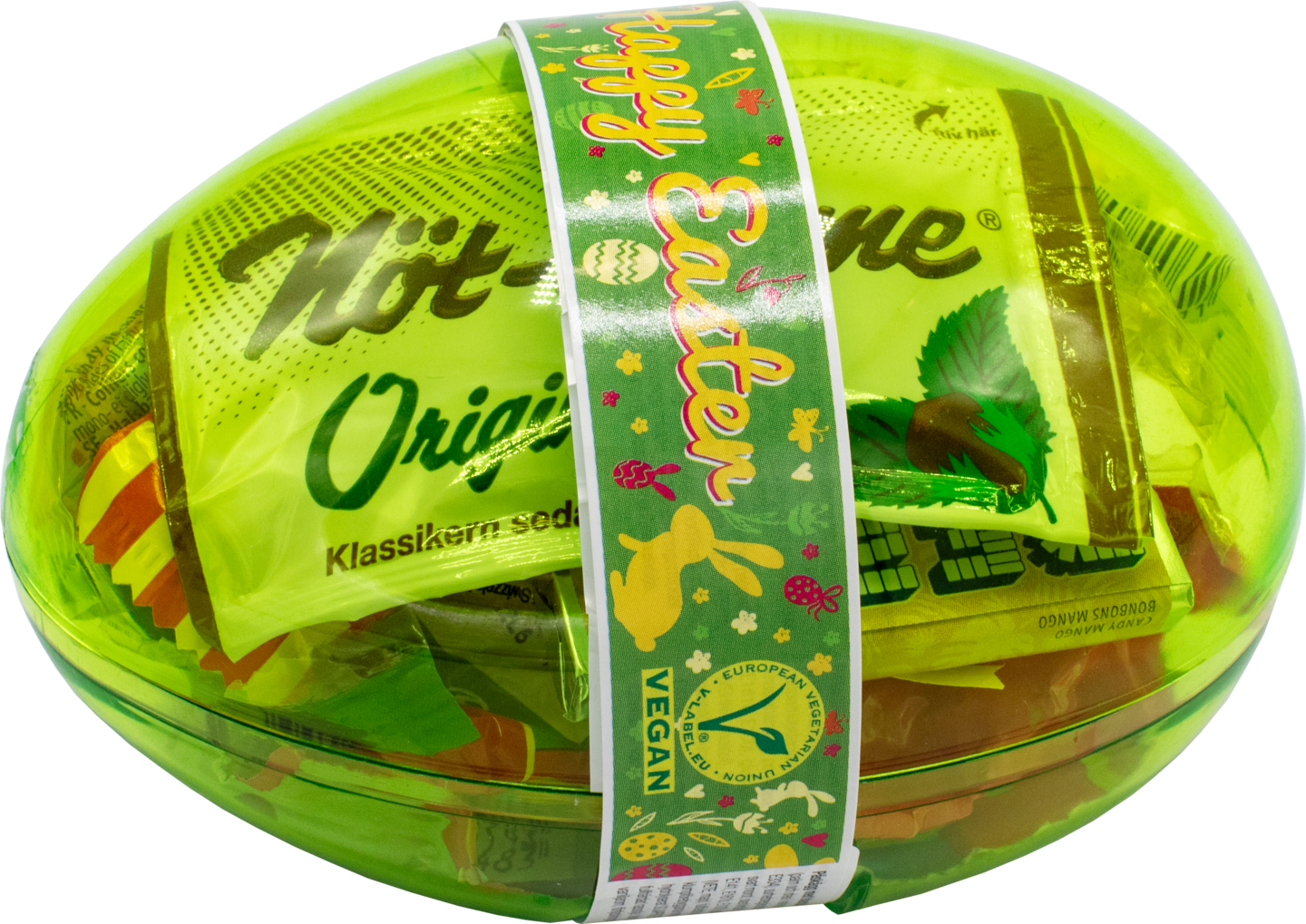 VegaaninenKaikkien pitää voida syödä karkkia! Tällä periaatteella olemme luoneet pääsiäismunan, joka sisältää 100 % vain herkullisia vegaanisia makeisia.