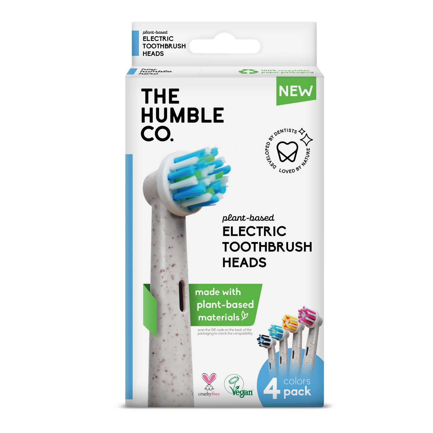 Kasvipohjaiset sähköhammasharjan päät, jotka näyttävät ja tuntuvat tavallisilta muovihammasharjan päiltä. Harjaspää on valmistettu vehnätärkkelyksestä, joka on yksi tärkeimmistä ainesosista, ja pehmeät harjakset on valmistettu korkealaatuisesta BPA-vapaasta nailonista, jossa on 65 % risiiniöljystä peräisin olevia kasviperäisiä materiaaleja.