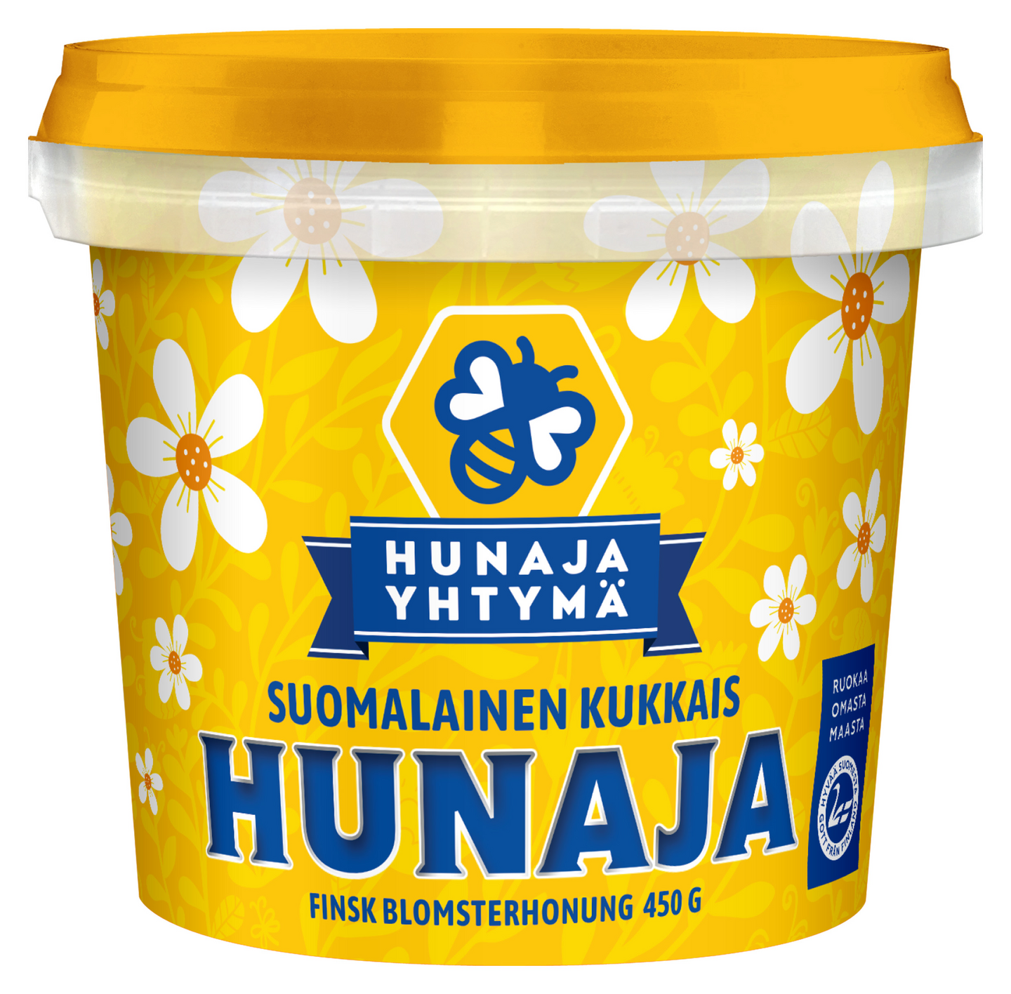 Suomalainen kukkaishunaja perinteisessä 450 gramman purkissa on Hunajayhtymän klassikkotuote. Kaikkein tunnetuimmassa ja myydyimmässä tuotteessamme on perinteistä suomalaista monikukkahunajaa. Satokasveja ovat muun muassa vadelma ja apila, mutta mukana on kaikkia muitakin kesäisiä mesilähteitä tuomassa omat arominsa. Hunaja on miedon makuista, tummahkon keltaista ja melko kiteistä, kuitenkin pehmeää ja helposti lusikoitavaa.