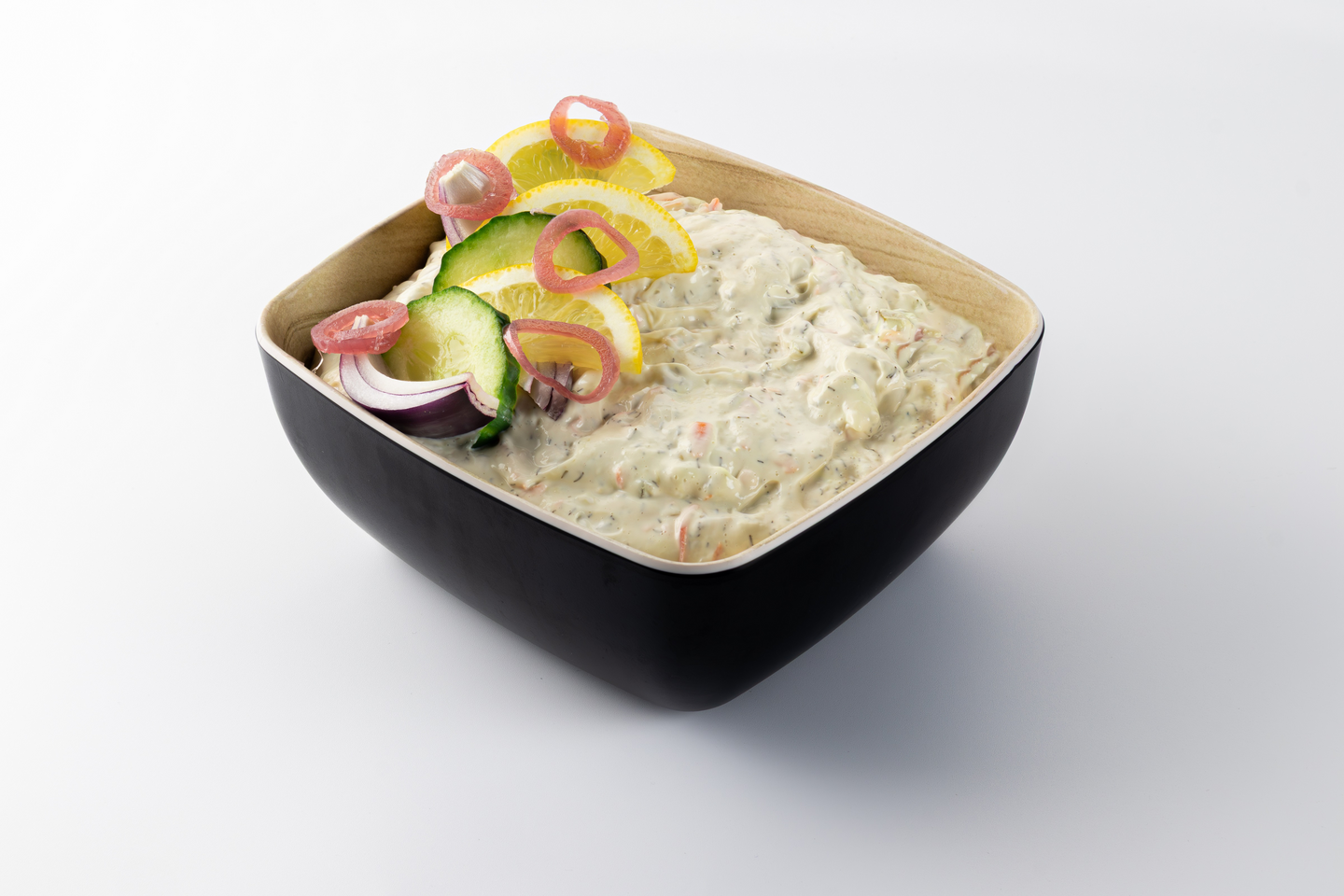 Majonnäs [rapsolja, vatten, ÄGG, socker, salt, förtjockningsmedel (E412, E415), konserveringsmedel (E211, E202), SENAP [SENAPSFRÖ, modifierad majsstärkelse, färgämne (E150a), vitpeppar], surhetsreglerande medel (E260, E330)], gurksallad [gurka, lök, paprika, ättika, surhetsreglerande medel (E331), förtjockningsmedel (E407), SENAPSFRÖ, gurkmeja, antioxidant (E300), aromer, färgämne (E140)], morot, dill.