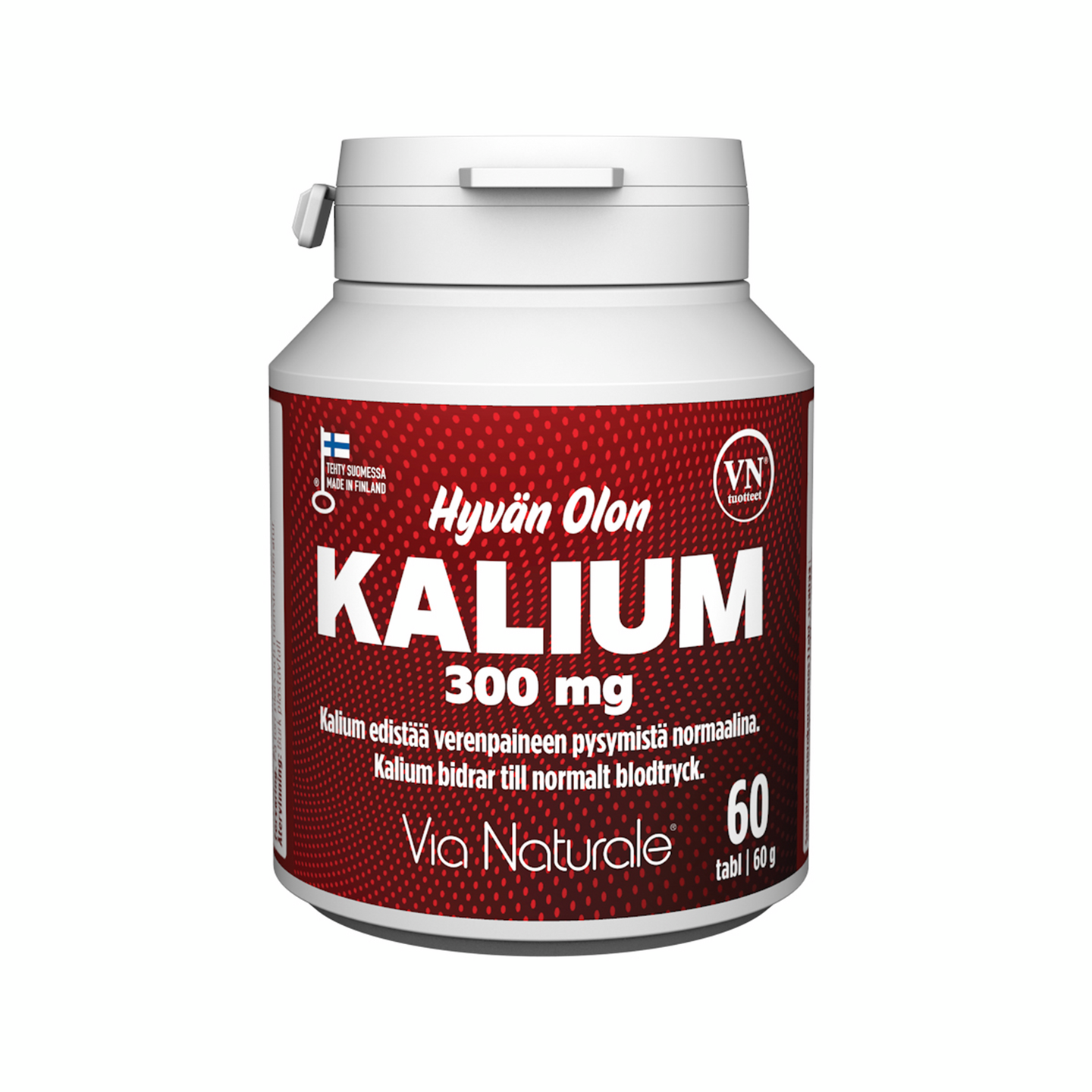 Kaliumvalmiste, ravintolisä. Kalium edistää: verenpaineen pysymistä normaalina