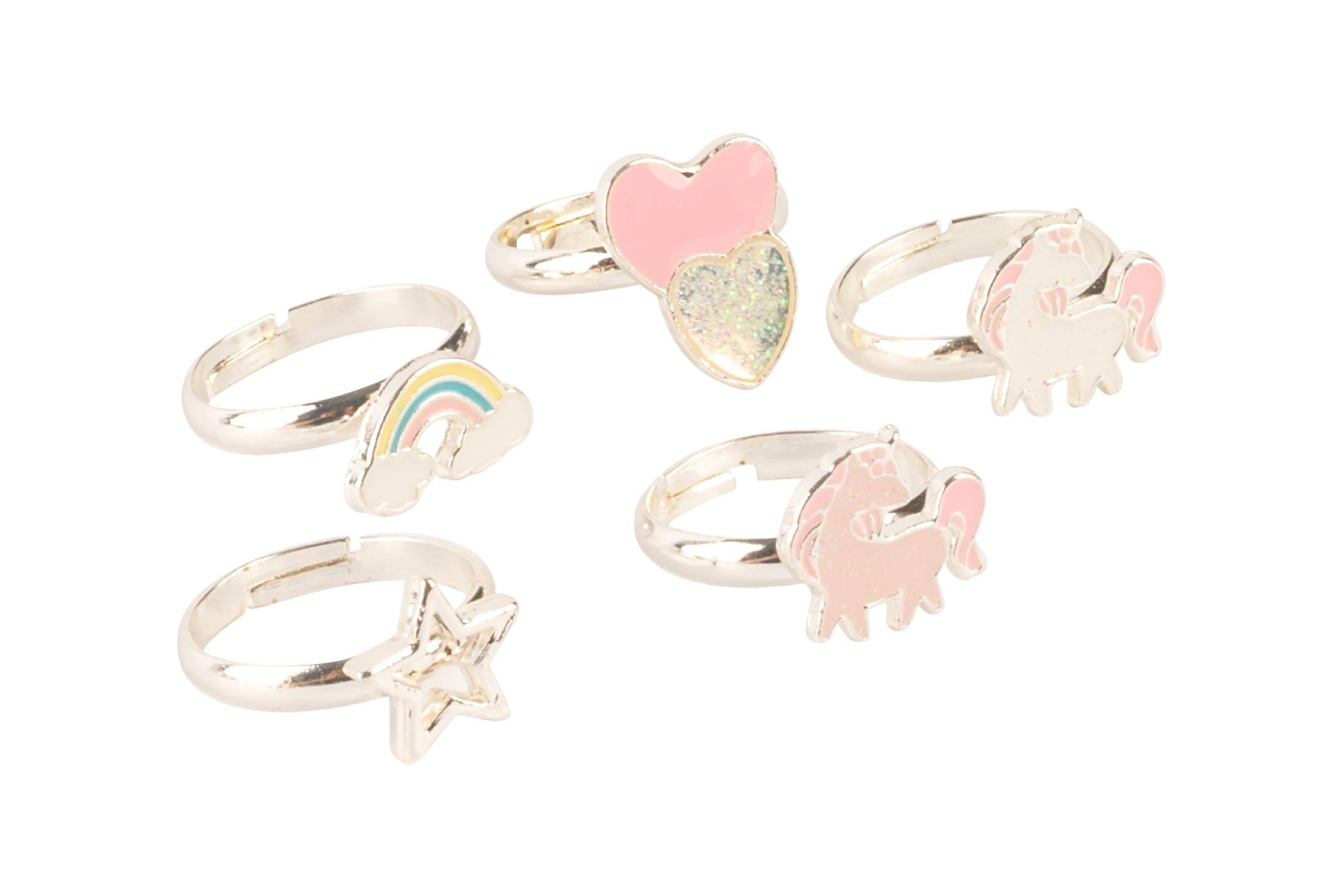 Lasten söpö sormusrasia. Sisällä 5 erilaista säädettävää sormusta. Ihana lahjaidea valmiissa rasiassa. Nikkelitestattu EU 94/27/EEC.