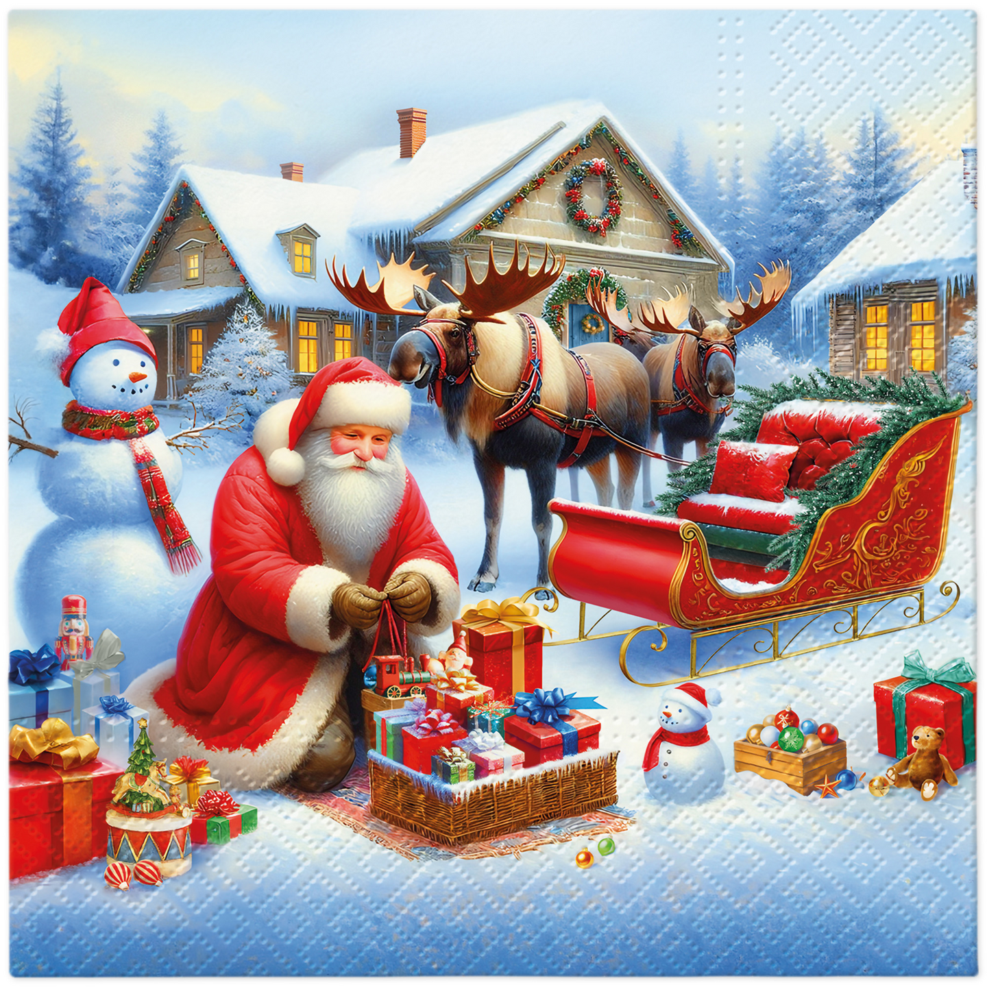 Luo joulupöytään satumainen tunnelma näillä suurilla Joulupukki ja reki -kuosisilla lautasliinoilla. Koko 33 x 33 cm tarjoaa sekä näyttävyyttä että käytännöllisyyttä, ja paketissa on 20 kappaletta – täydellinen valinta joulun juhlahetkiin.