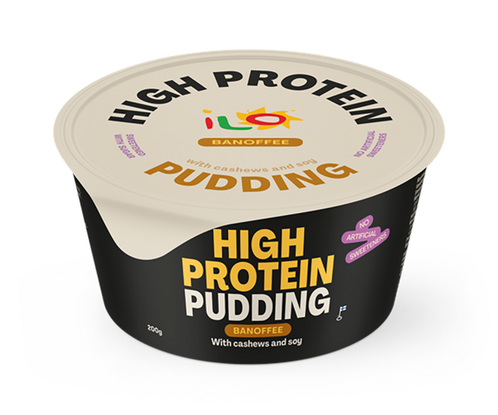 VegaaninenIlo High protein pudding banoffee on cashewpohjainen proteiinivanukas. Purkissa on 20 grammaa laadukasta kasviproteiinia, eikä siinä ole keinotekoisia makeutusaineita. Makeus tulee banaanisoseesta ja ripauksesta sokeria.