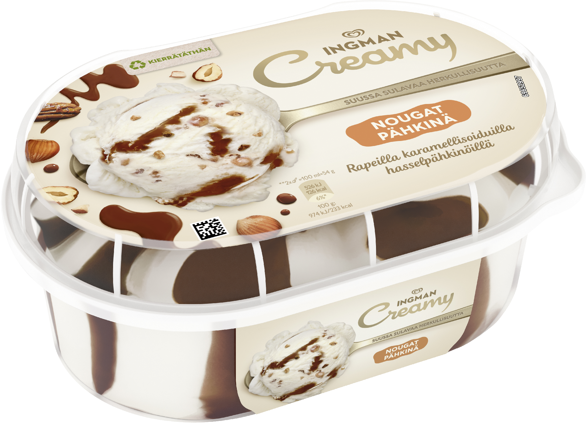 Ainesosat: Rasvaton MAITO, sokeri, KERMA, rasvaton MAITOJAUHE tai -tiiviste, rypälesokeri, glukoosisiirappi, rapsiöljy, HASSELPÄHKINÄ (2,5%) MAITORASVA, rasvaton MAITOJAUHE, PEKAANIPÄHKINÄ (0,4%), emulgointiaine (rasvahappojen mono- ja diglyseridit [kasviperäinen], lesitiini) vähärasvainen kaakaojauhe, stabilointiaineet (guarkumi, johanneksenleipäpuujauhe, tarakumi, karrageeni), aromit, kookosrasva, VOI, suola. Saattaa sisältää macadamiapähkinöitä, mantelia ja saksanpähkinöitä.