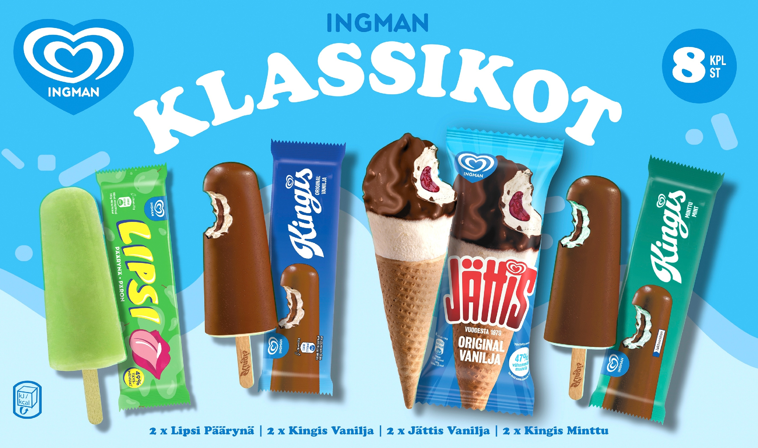 Ingmanin rakastetuimmat klassikkojäätelöt yhdistivät voimansa monipakkauksessa, joka sopii moneen makuun ja tilanteeseen! Nyt Jättis Vanilja, Kingis Vanilja, Kingis Minttu ja Lipsi Päärynä samassa pakkauksessa. Legendoja 1970-luvulta tähän päivään.