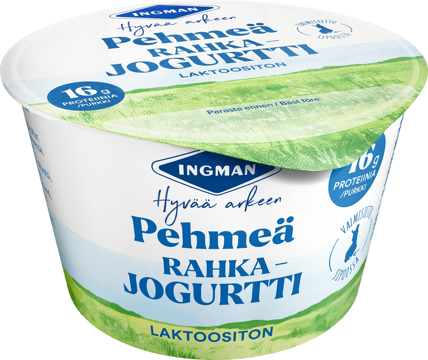 LaktoositonIngman-Hyvää arkeen. Mieto ja pehmeä Ingman rahkajogurtti, jossa on runsaasti proteiinia. Tuote on laktoositon ja rasvaton. Sopii hyvin aamupalaksi, iltapalaksi tai välipalaksi.