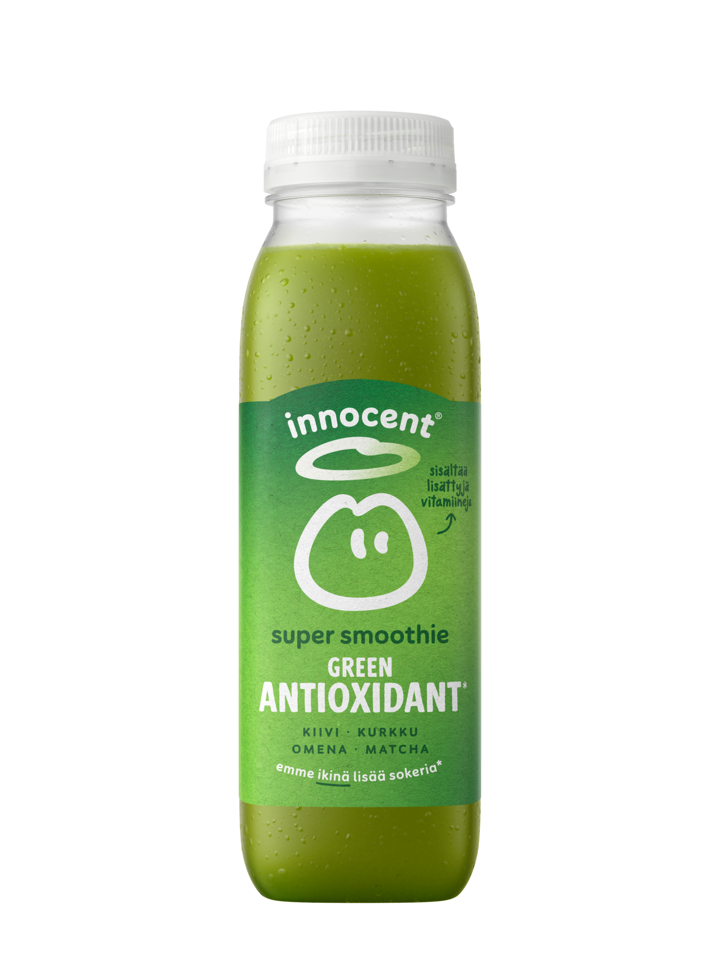 1½ puristettua omenaa (61%) ½ soseutettua banaania**, 8 puristettua vihreää viinirypälettä ¼ murskattua mangoa, hieman murskattua kiiviä (6,1%), hieman puristettua kurkkua (1,5%), tilkka spirulinauutetta, hieman jauhettuja pellavansiemeniä (0,39%), tilkka limettitäysmehua (0,21%), tilkka safloriuutetta, tilkka matchavirheräteeuutetta (0,05%) ja vitamiineja (B1, B2, B3, B6, C & E).