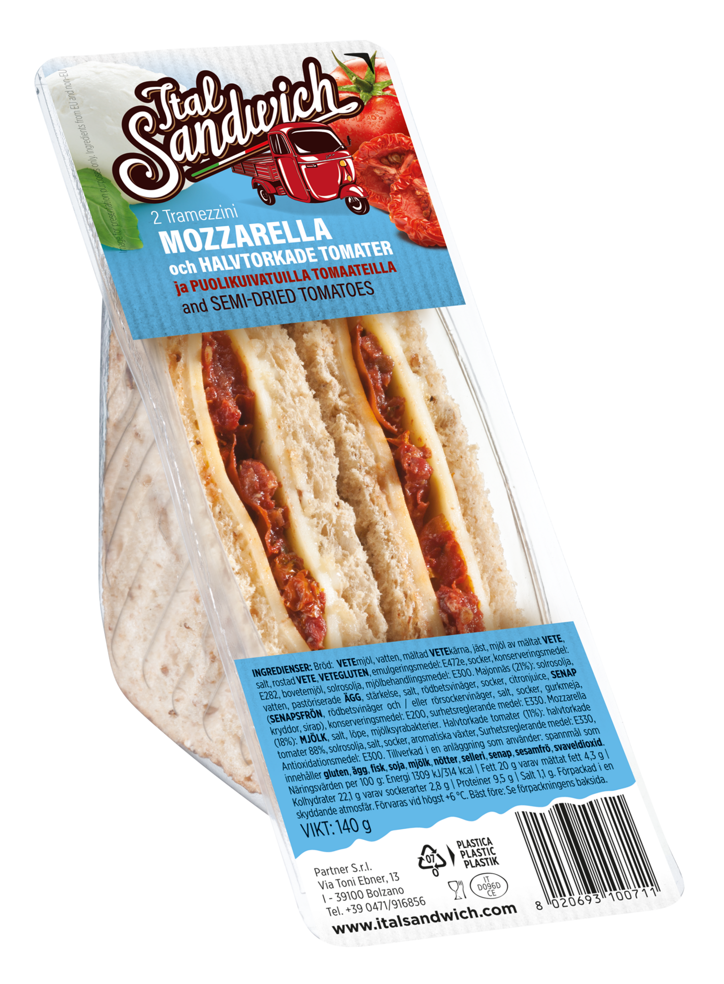 AINESOSAT: Leipä: VEHNÄJAUHO, vesi, mallastettu VEHNÄYDIN, hiiva, VEHNÄmallasjauho, suola, paahdettu VEHNÄ, VEHNÄGLUTEENI, emulgointiaine: E472e, sokeri, säilöntäaine: E282, tattarijauho, auringonkukkaöljy, jauhojen käsittelyaine: E300. Majoneesi (21%): auringonkukkaöljy, vesi, pastöroitu KANANMUNA, tärkkelys, suola, juurikasetikka, sokeri, sitruunamehu, SINAPPI (SINAPINSIEMEN, juurikasetikka ja / tai ruokosokerietikka , suola, sokeri, kurkuma, mausteet, karamellisoitu sokerisiirappi) säilöntäaine: E200, happamuudensäätöaine: E330. Mozzarella (18%): MAITO, suola, juoksute, hapatteet. Puolikuivattu tomaatti (11%): Puolikuivattu tomaatti 88%, auringonkukkaöljy, suola, sokeri, kuivattu valkosipuli-sipuli-persilja-oregano, hapettumisenestoaine: E300 askorbiinihappo, happamuudensäätöaine: E330 sitruunahappo. Valmistettu tehtaassa, jossa käsitellään: gluteenia sisältäviä viljoja, kananmunia, kalaa, soijaa, maitoa, pähkinöitä, selleriä, sinappia, seesaminsiemeniä, rikkidioksidia, lupiineja.