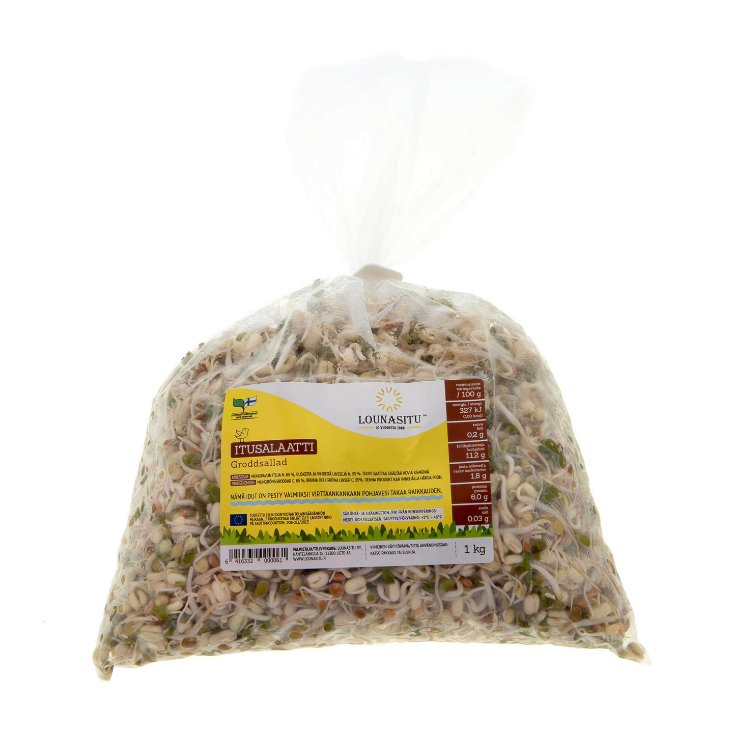 Mungpavun ituja n.65%, ruskeita ja vihreitä linssejä n. 35%. Tuote saattaa sisältää kovia siemeniä.