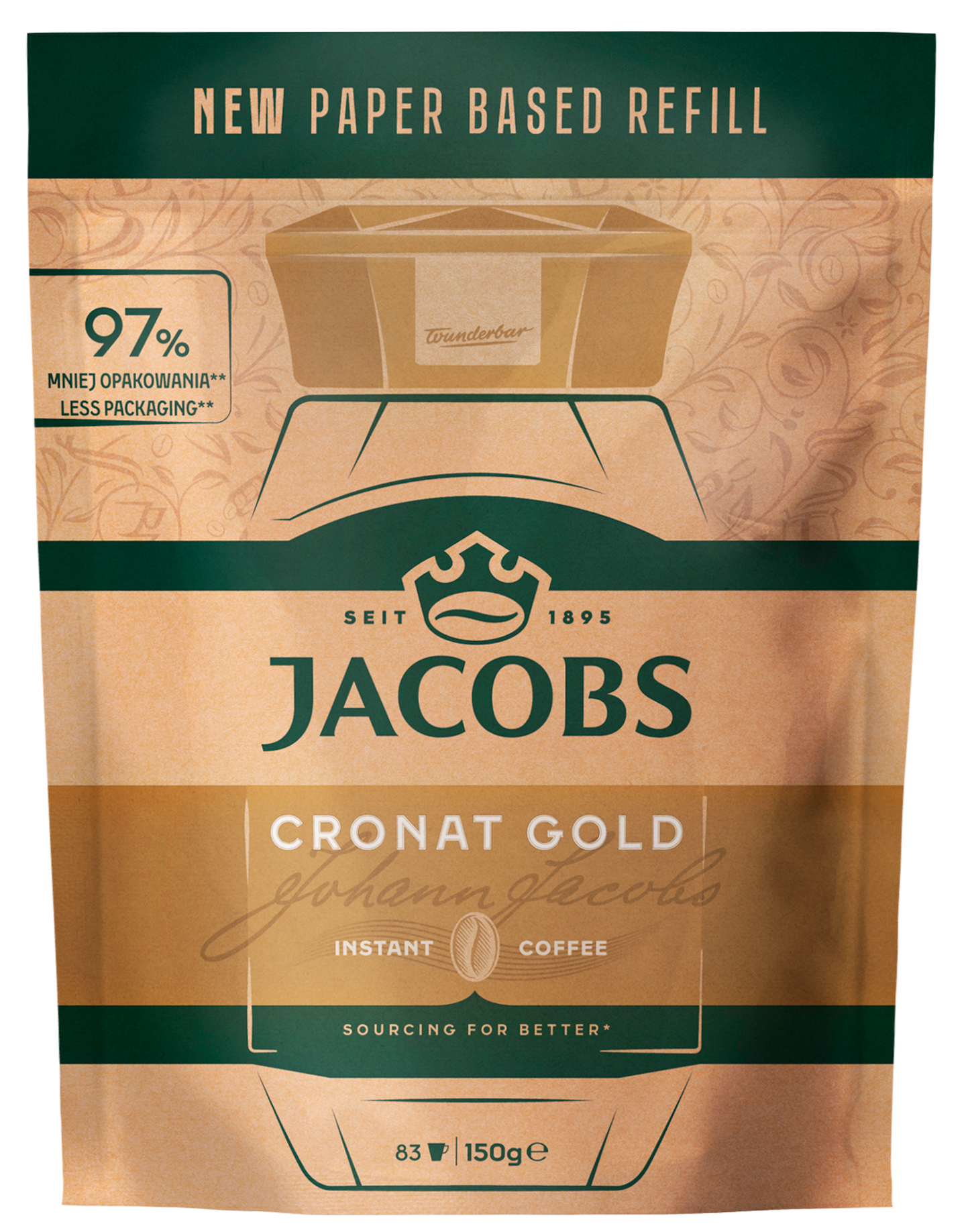 Jacobs Cronat Gold -pikakahvi jälleensuljettavassa pussissa, joka kulkee helposti mukana esimerkiksi retkellä. Voit myös täyttää tyhjentyneen lasipurkkisi. Pakastekuivattu pikakahvi, josta teet täydellisen pitkän tumman kahvin täyteläisellä aromilla. Jälleensuljettava täyttöpussi säilyttää kahvin aromit tehokkaasti. Mieto ja pehmeä aromi. UUSI YMPÄRISTÖYSTÄVÄLLINEN PAPERIPUSSI!