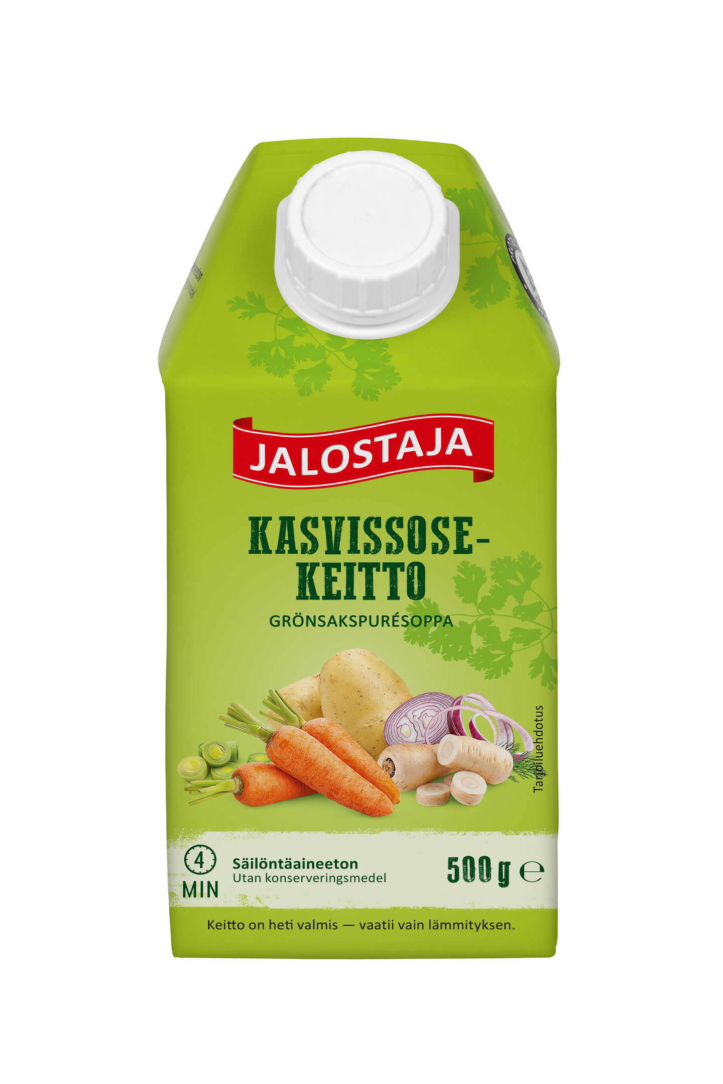 Jalostajan Kasvissosekeitto on säilöntäaineeton arkiruokien klassikko. Pakkauksessa on kätevä korkki, jonka ansiosta keitto säilyy avattuna jääkaapissa jopa kolme vuorokautta.