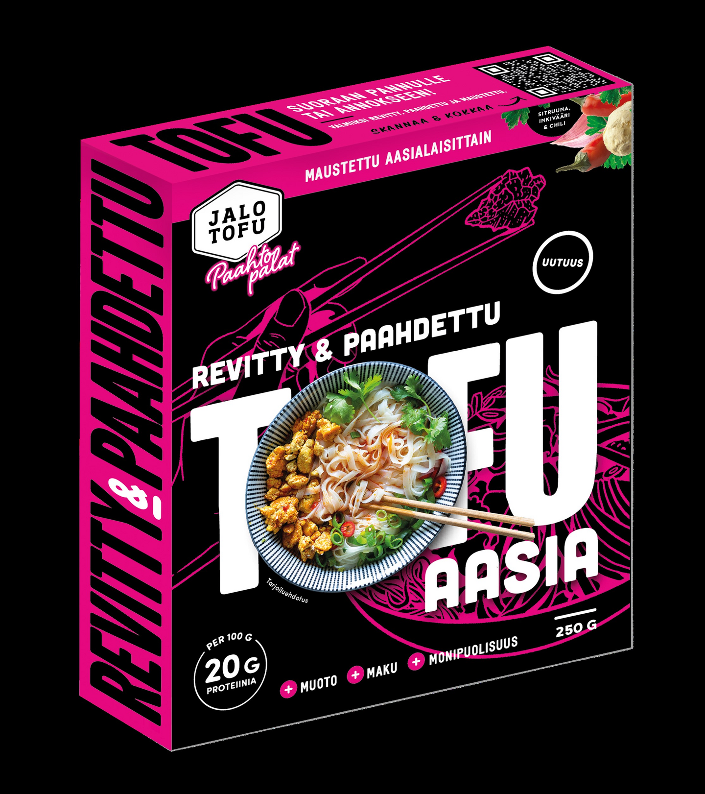 VegaaninenProteiinipitoinen, kasvispainotteinen ja maukas kotiruoka ei enää voisi olla helpompaa! Valmiiksi revityt, täyteläisen makuisiksi maustetut ja paahdetut Jalotofu Paahtopalat Aasia ovat tofun maukkain uusi muoto. Käytä paahtopaloja kanan tai lihan sijaan tai rohkeasti sellaisenaan. Pakkauksesta suoraan pannulle tai uunipellille kätevästi tyhjennettävät, suuhun sopivat paahdetut tofupalat tarvitsee ainoastaan lämmittää. Kokeile salaateissa, aasialaisissa ruoissa, pasta-annoksissa - tai missä ikinä keksitkään! Paahtopalat ovat luomua, eivätkä sisällä lisäaineita.