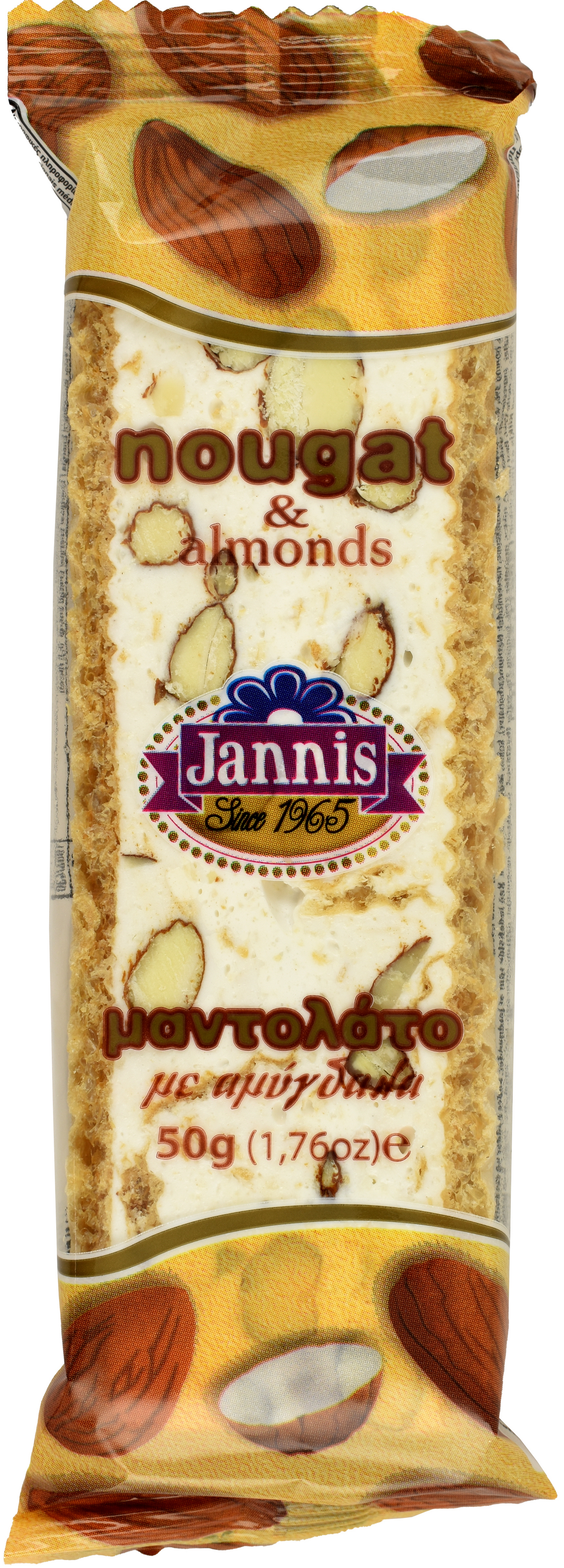 Samettisen suussa sulavaa nugaata ja maapähkinöitä ohuiden vohvelilevyjen väliin puristettuina. Kokonaiset pähkinät antavat mukavan purutuntuman pehmeälle nugaalle. Jannis mantelinougat on mainio välipala ja hyvä energian lähde.