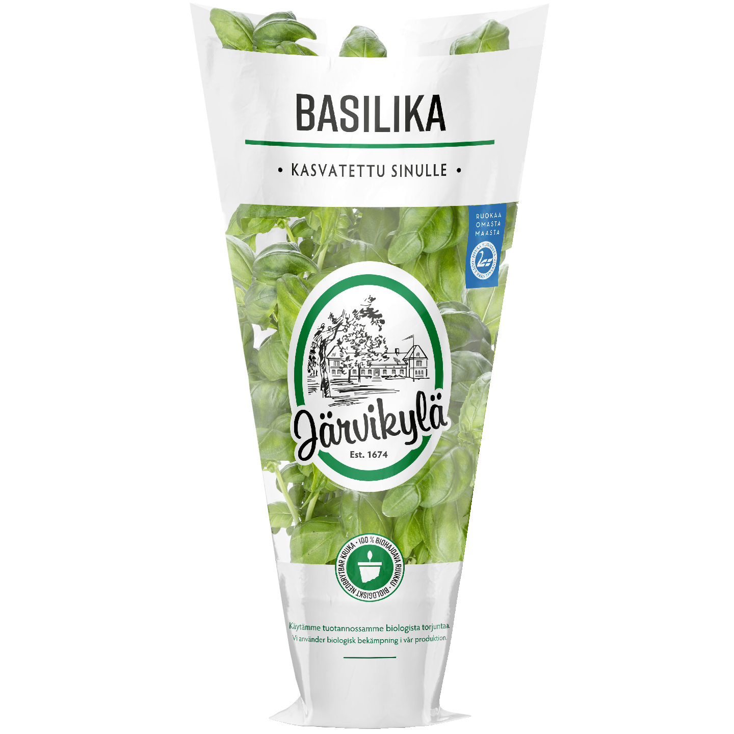 Suomalaisessa basilikassa on muhkeat lehdet ja tuuheat oksat. Saat makua ja tuoksua pizzaan, pastaan, pestoon ja keittojen pintaan.