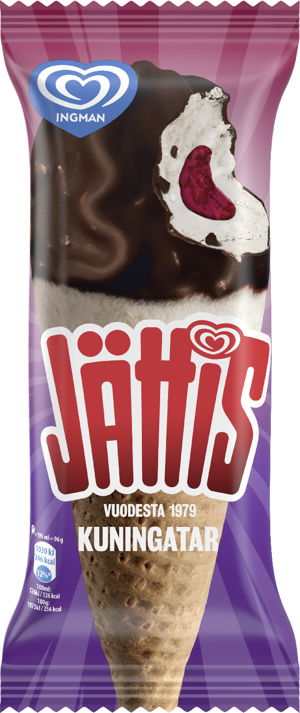 Tämä jäätelöuutuus on teille, isojen tuuttien ja kuningatarmarjojen ystävät! Jättis Kunigatar 195ml sisältää kermaista vaniljajäätelöä yhdistettynä runsaaseen vadelma-mustikkakastikkeeseen. Suklaanmakuinen kuorrute ja herkullinen, rapea vohveli kruunaavat koko komeuden.